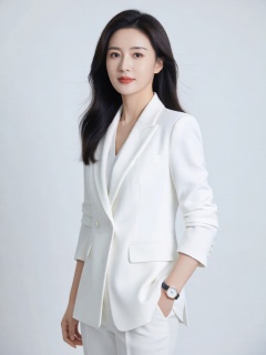 DJYS, 短剧影视人像质感,干练职场精英女性立于纯白纯色背景前,眼神自信从容,身穿白色剪裁西装,搭配简约腕表,正面柔光塑造专业形象,极简背景凸显职场女性的知性气场