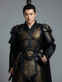 DJYS, 短剧影视人像质感,披甲古风将军立于铁灰哑光背景中央,神情威严霸气,身穿黑金鳞甲战甲,腰系兽纹玉带,硬光勾勒铠甲质感,纯色背景尽显将军的威武气场