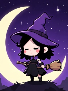 KTGN, Q 版卡通游戏概念设计,Q 版女巫少女戴着尖顶紫帽,手持迷你扫帚,立于弯月边缘,背景是深紫星空,简约轮廓线条,以紫、黑、鹅黄平涂为主,帽檐与裙摆做浅阴影,脸颊带红晕,构图轻盈梦幻,营造神秘可爱的魔法氛围