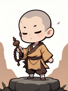 KTGN, Q 版卡通游戏概念设计,Q 版武僧少年光头素衣,手持木质念珠,站在菩提石台之上,背景为浅棕禅意留白,简洁质朴线条,土黄、深棕、米白平涂配色,衣褶做浅阴影塑造层次,构图沉稳平和,禅意与萌感兼具