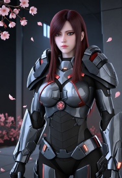 (cowboy shot:1.2),(looking at viewer:1.1),masterpiece,(best quality),smog,Dark room,dim lighting,peach blossom,falling petals,<lora:YQ_Illustrious光辉v5_蔷薇_V1:0.8>,q1528437228,1girl,solo,long hair,armor,brown hair,red hair,shoulder armor,pauldrons,bodysuit,power armor,grey eyes,brown eyes,purple hair,swept bangs,blue eyes,boots,breastplate,earrings,gauntlets,