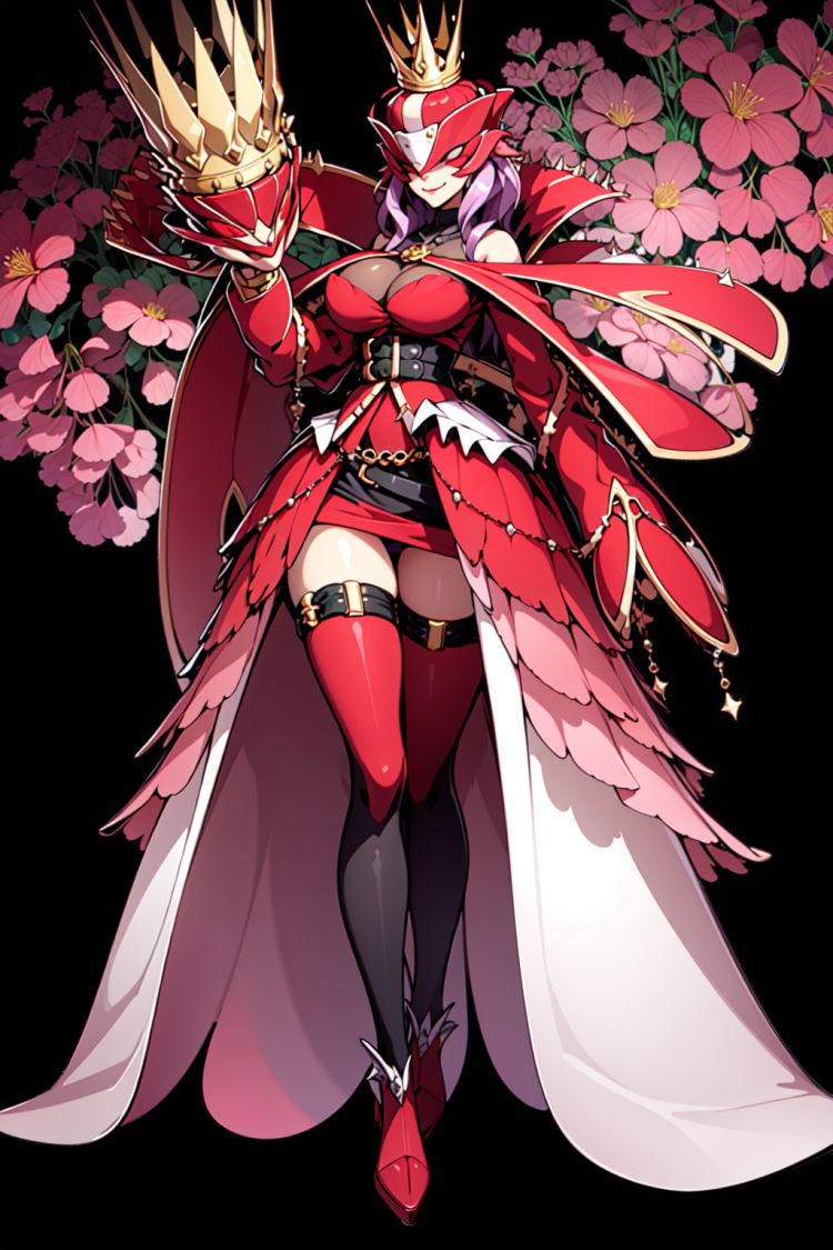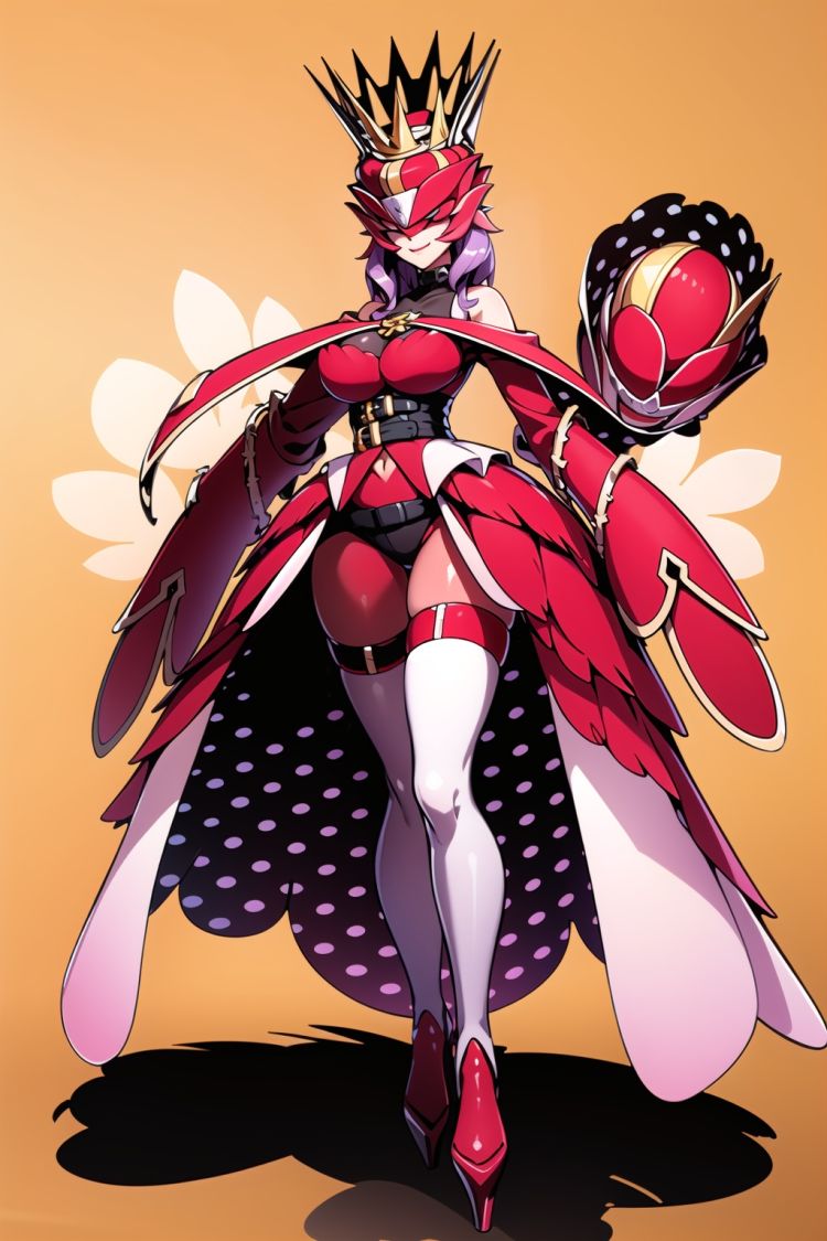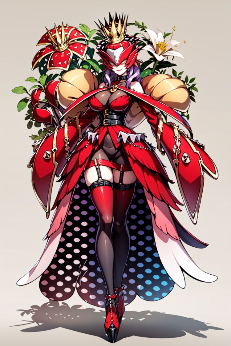 正面:Rafflesimon, 1girl, solo, helmet, breasts, high heels, full body, purple hair, dress, mask, thighhighs, large breasts, standing, smile, belt, crown, <lora:(大王花兽v1)Rafflesimon:0.8>, closed mouth, puffy long sleeves, yellow skin, floral background,