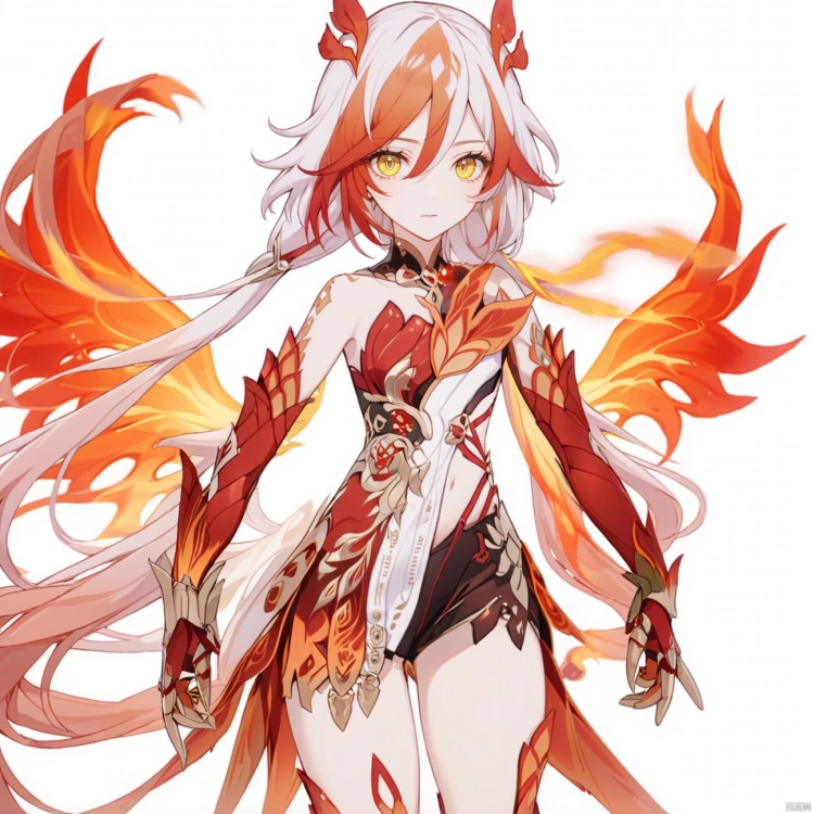 messy hair,bare shoulders,gauntlets,mechanical parts,white skin,phoenix,shorts,collarbone,jewelry,twintails,eyelashes,elbow gloves,armor,red legwear,thighhighs,boots,facial mark,head wings,red gloves,two-tone hair,earrings,gloves,tassel,leotard,skirt,dress,elbow gloves,twintails,bare shoulders,tattoo,phoenix,ribbon,red ribbon,bangs,white hair,orange eyes,streaked hair,fu hua,orange hair,fiery hair,hair between eyes,multicolored hair,fiery wings,jewelry,hair ornament,gloves,hair ribbon,pattern on hair,logo,yellow pupils,diamond shaped pupils,