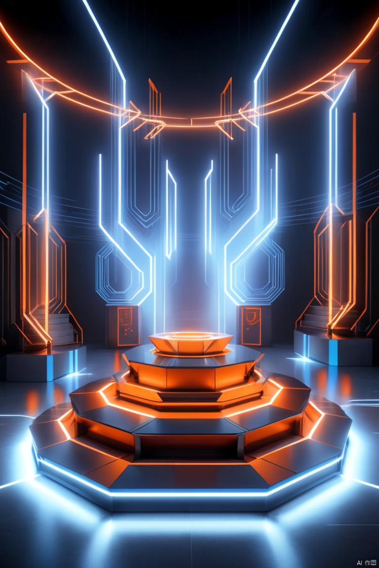 展台:(masterpiece, top quality, best quality, official art, beautiful andaesthetic:1.2),saibofeng,podidum,building,bluetheme,light