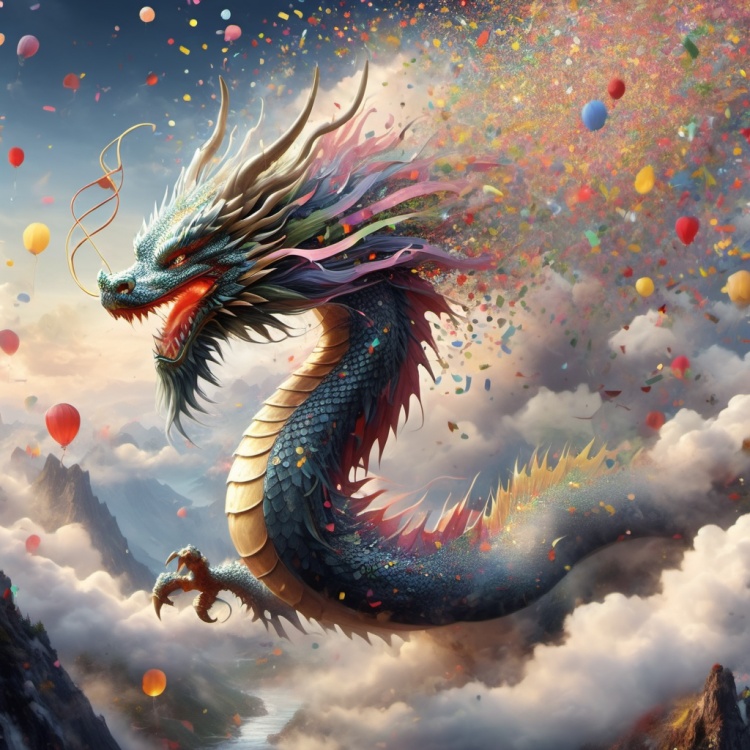 Picture a dragon flying over a city, sending confetti down to those celebrating Chinese new year below. Alternatively, imagine a nature dragon spirit leaving a trail of flower petals and clover leaves on the wind.
