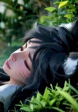 1girl, solo, long hair, breasts, large breasts, black hair, animal ears, cleavage, closed eyes, lying, on back, lips, fox ears, facial mark, whisker markings, korean clothes, ahri \(league of legends\)
