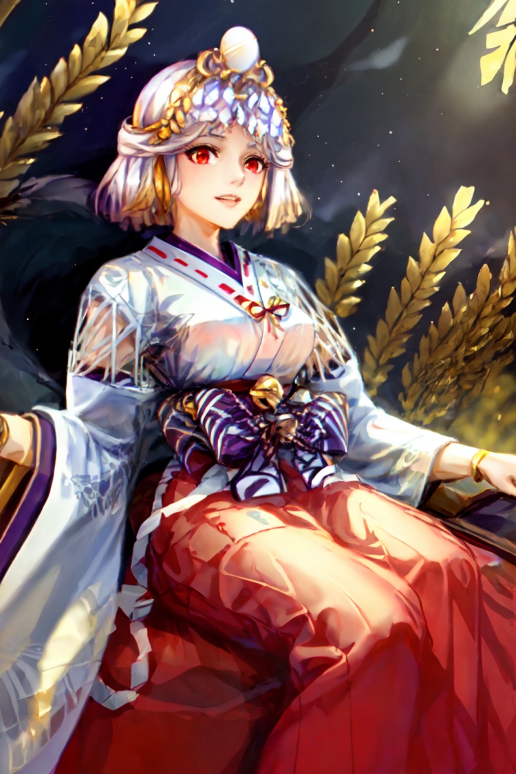 角色tag··1girl,solo,Red eyes, multicolored hair,Short hair,Hair accessories, moles at the corners of the mouth,,Japanese dress, traditional dress, miko, miko costume,White dress, bell decoration, Bow, long sleeves, wide sleeves, split sleeves,Red skirt, long skirt