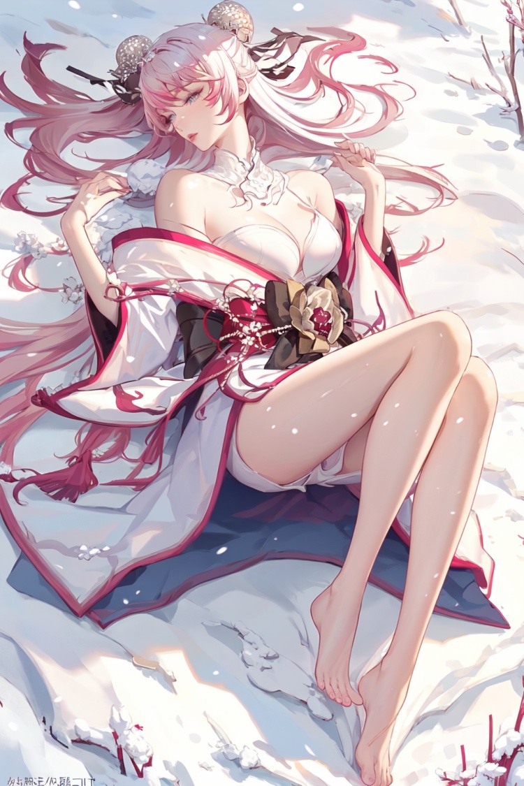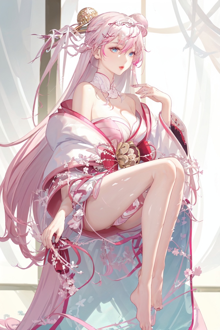 角色tag··1girl, solo, long hair, blue eyes, cleavage, pink hair, Japanese dress, cleavage, bare