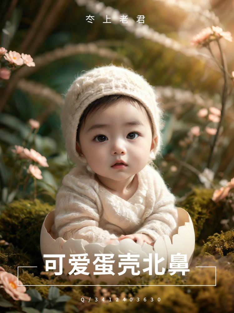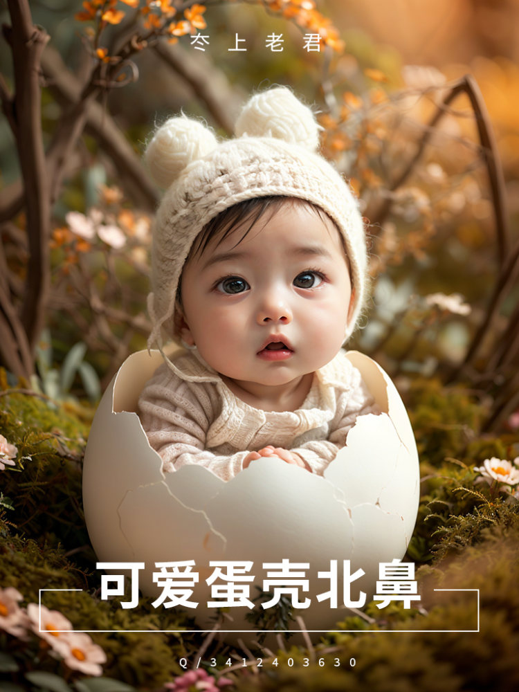 这一LoRA模型展现梦幻蛋壳北鼻,宝宝的眼睛明亮而好奇,小手紧握着蛋壳的边缘,仿佛在探索这个神奇的世界。背景是一片虚化的花草自然场景,为整个画面增添了一份生机与活力。