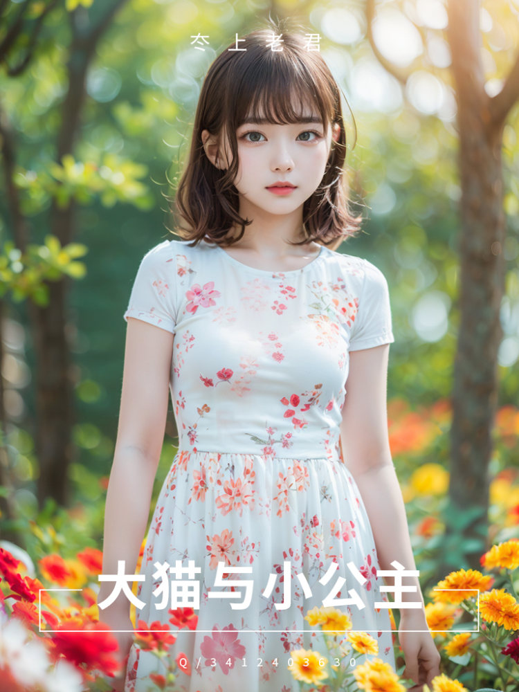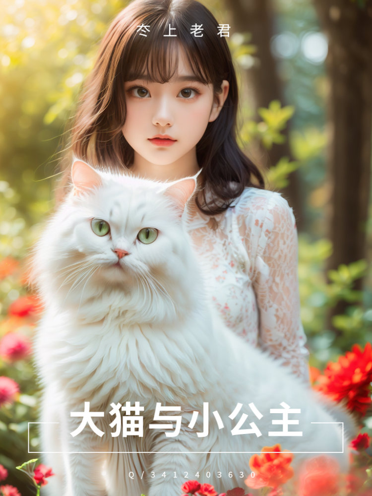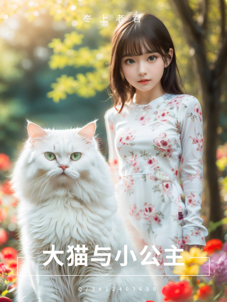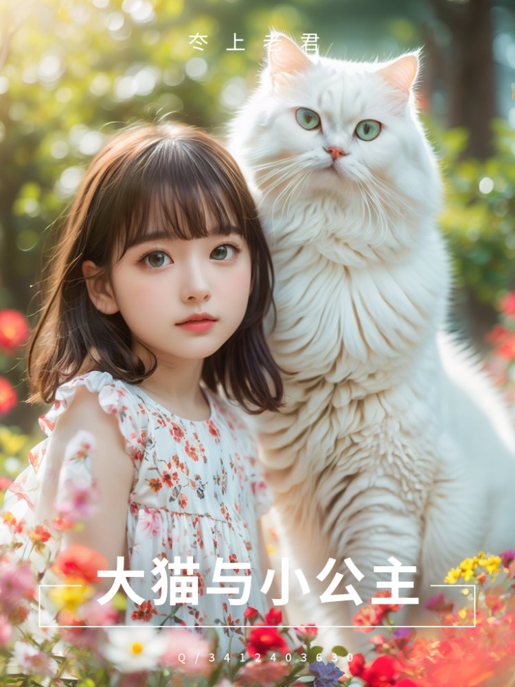 在春日的午后,阳光透过稀疏的云层,洒落在一处静谧的花丛中。这里花儿竞相绽放,在这片花海之中,一位活泼的小女孩和一只巨大的白色猫成为了主角。
