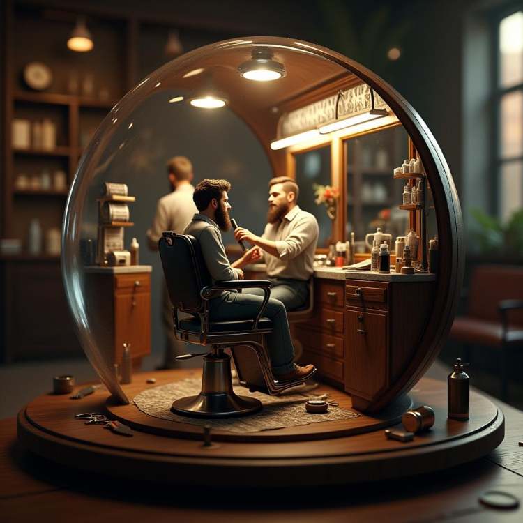 Each diorama is housed in a spherical or cylindrical structure, with the curved walls and fisheye perspective drawing viewers into an intimate, encapsulated world. Viewed through a transparent window or magnifying lens, these scenes reveal lifelike details such as tiny accessories, textured surfaces, and expressive characters, all brought to life with advanced 3D modeling techniques and rendered with cinematic quality.