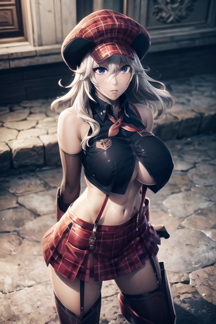 1girl,solo,White hair, purple eyes, wearing a hat, black clothes, showing the whole belly, one hand wearing a red bracelet, red grid skirt, suspenders, black stockings, boots, one hand wearing a sleeve,
