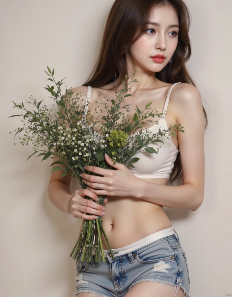 1 girl, solo, long hair, brown hair, belly button, shirtless, holding a bouquet of flowers with both hands to cover her body, revealing the edge of her underwear, waist chain, pants, lips, denim shorts, sideways, leaning against the wall, realistic