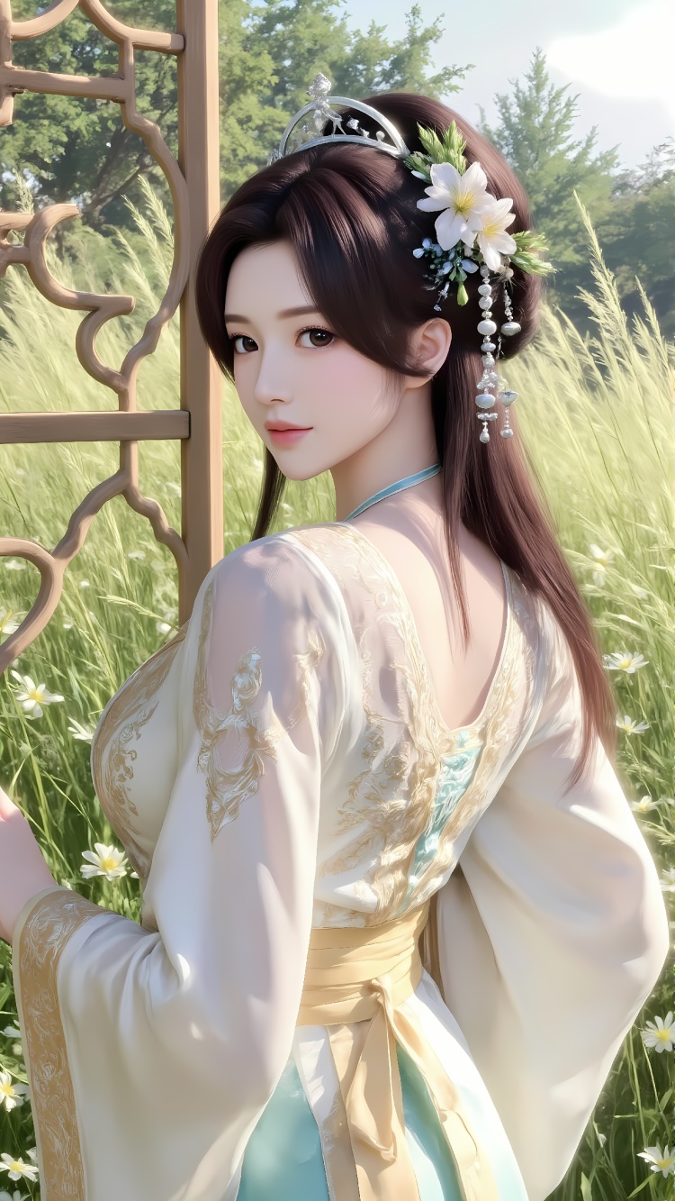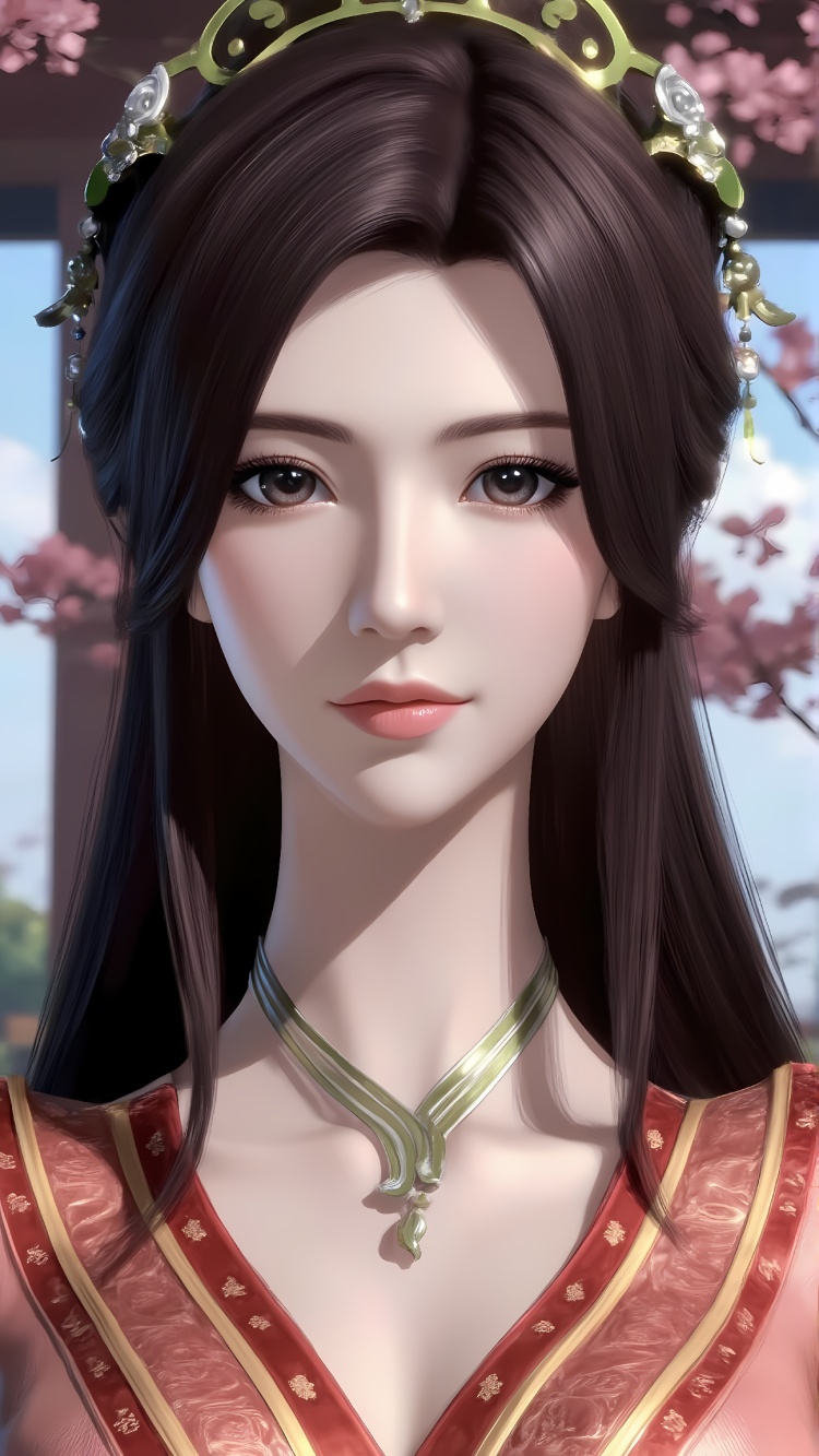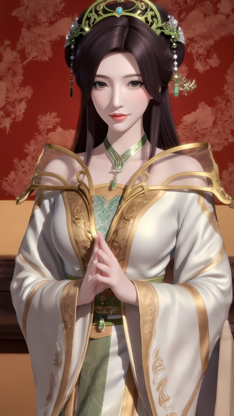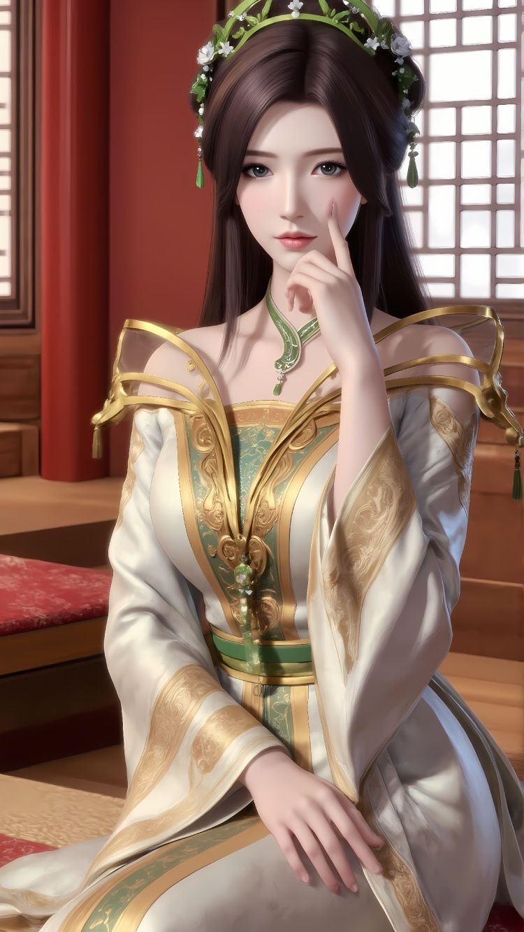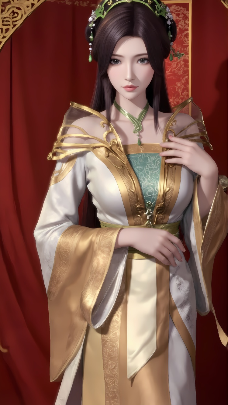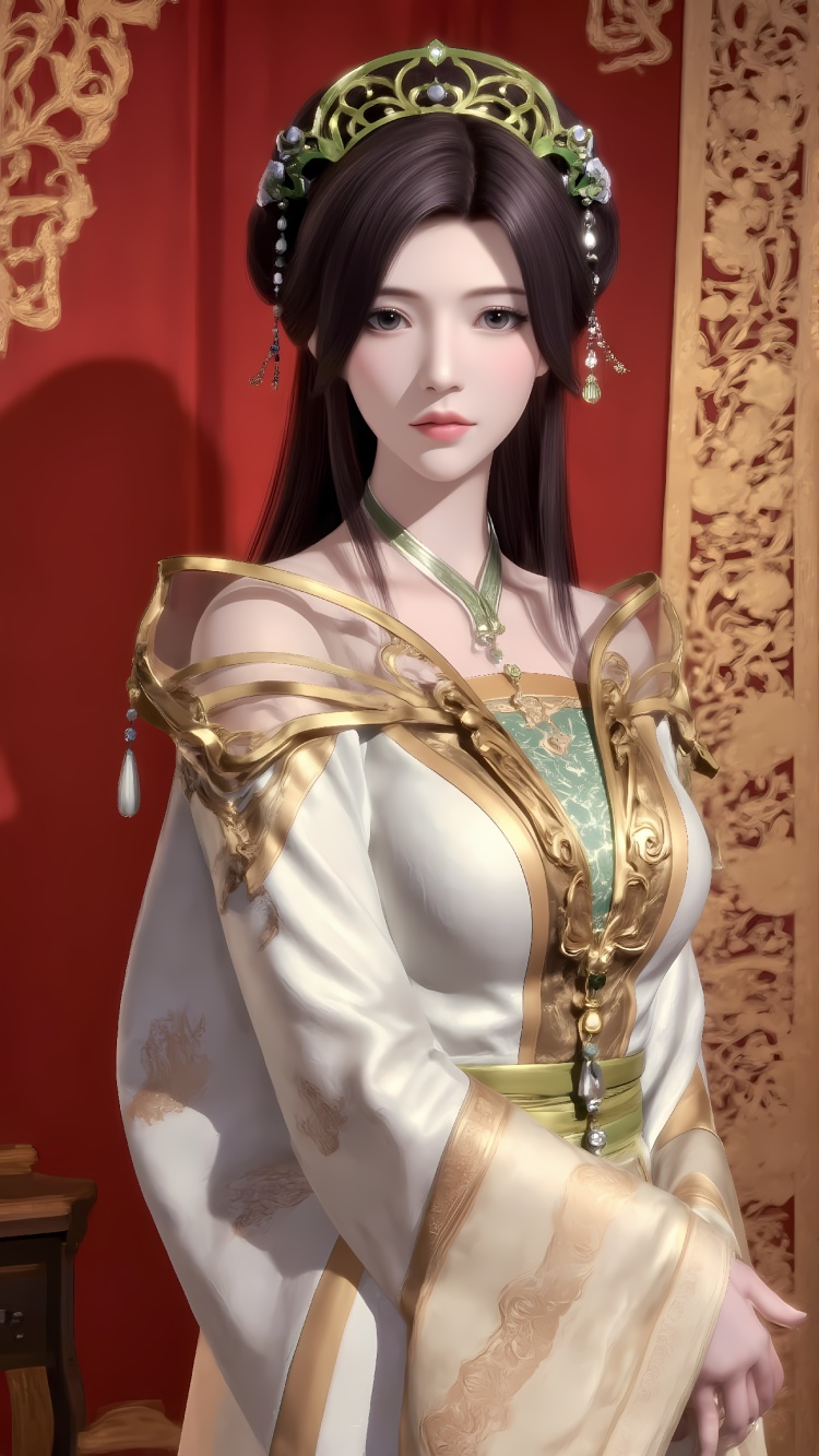 推荐提示词2:The image is a digital illustration of a young woman dressed in traditional Chinese clothing. She is standing in front of a red-tiled wall with a large window in the background. The woman is wearing a white and gold dress with intricate gold embroidery and a green headpiece with a floral design. She has long dark hair styled in loose waves and is looking off to the side with a serious expression on her face. The overall mood of the image is elegant and regal.