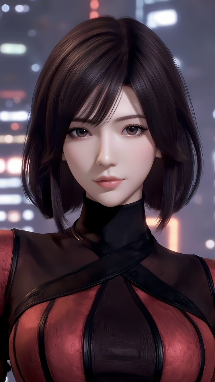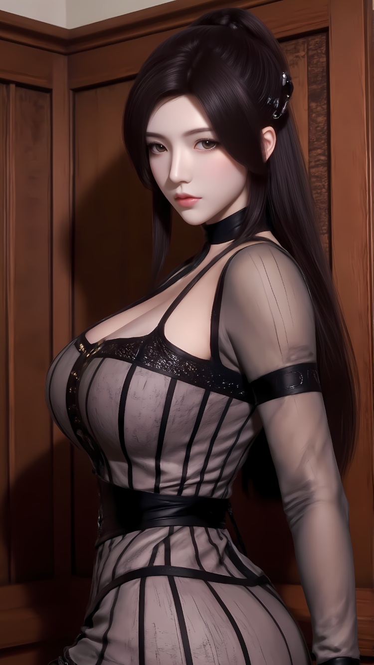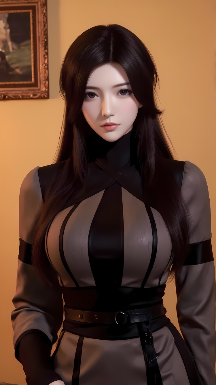 推荐提示词8夜行衣:The image is a portrait of a young woman with long dark hair. She is standing in a room with a yellow wall and a painting hanging on the wall in the background. The woman is wearing a black and grey dress with a high neckline and a black belt around her waist. She has a serious expression on her face and is looking directly at the camera. Her hair is styled in a sleek, straight look and falls over her shoulders. The overall mood of the image is dark and mysterious.
