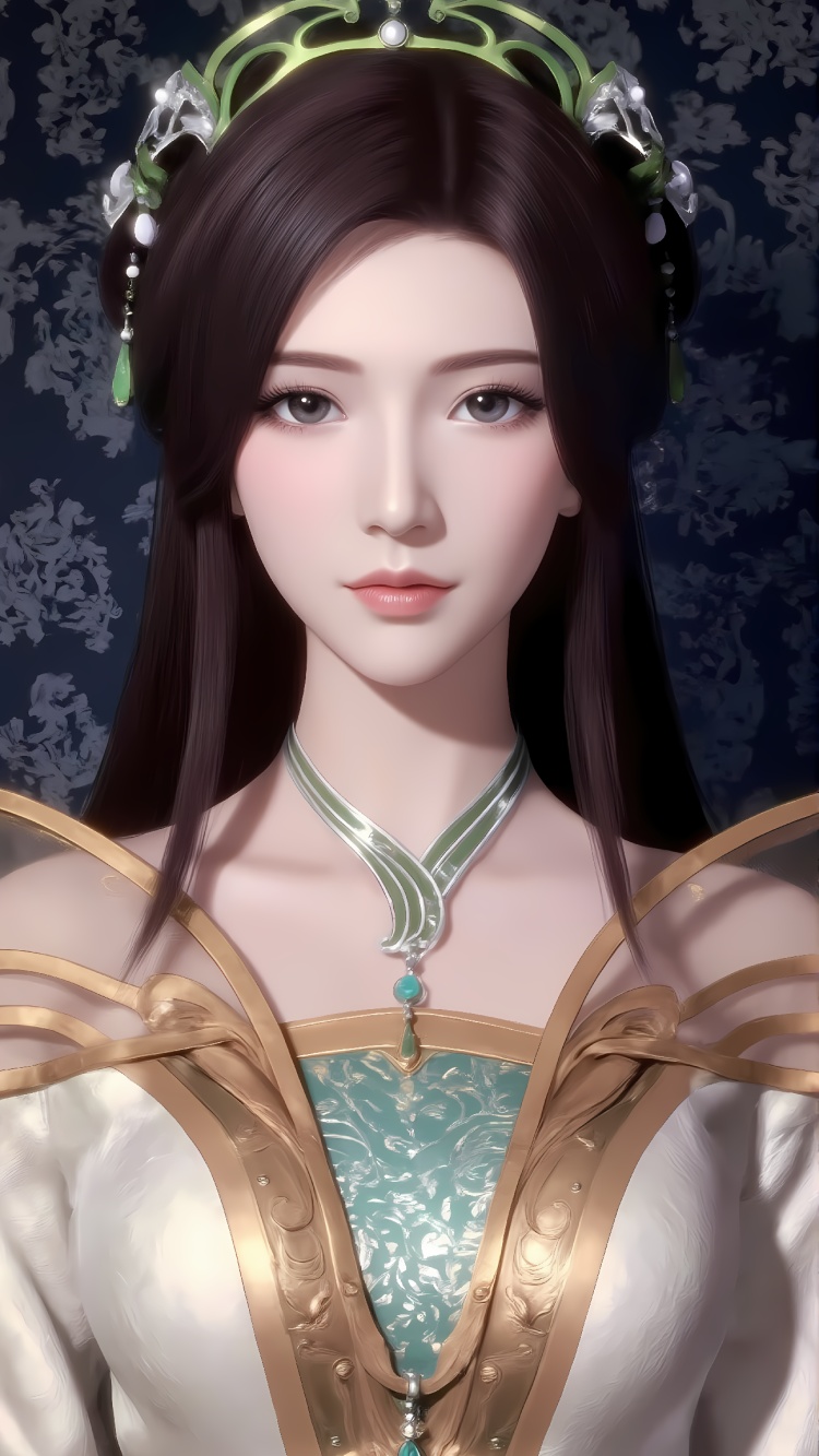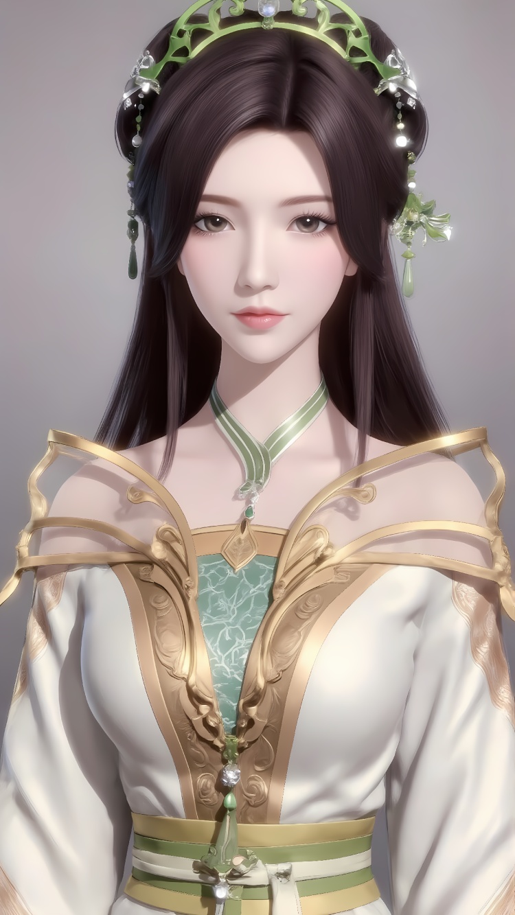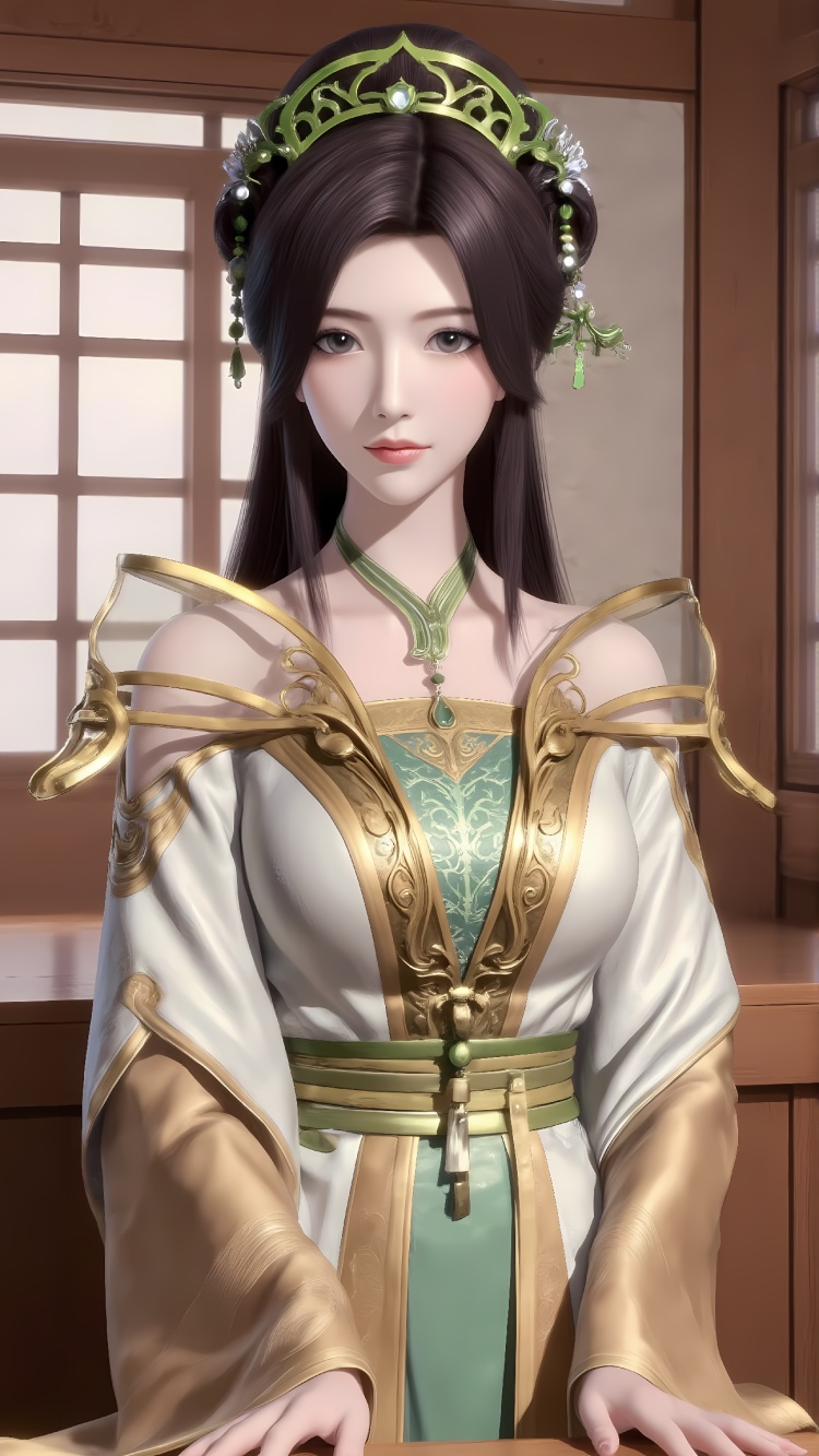 推荐提示词3:The image is a digital illustration of a young woman wearing a traditional Chinese outfit. She is standing in front of a wooden table with a window in the background. The woman has long dark hair styled in a high ponytail and is wearing a green and gold headpiece with intricate designs. The headpiece is made up of a large green flower with gold accents and a gold chain necklace. She has a serious expression on her face and her hands are resting on the table. The overall color scheme of the outfit is green, gold, and white.