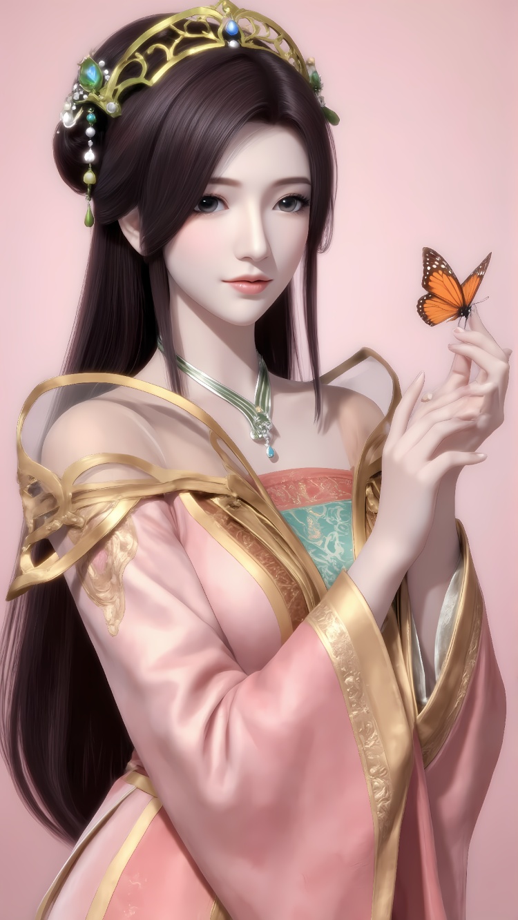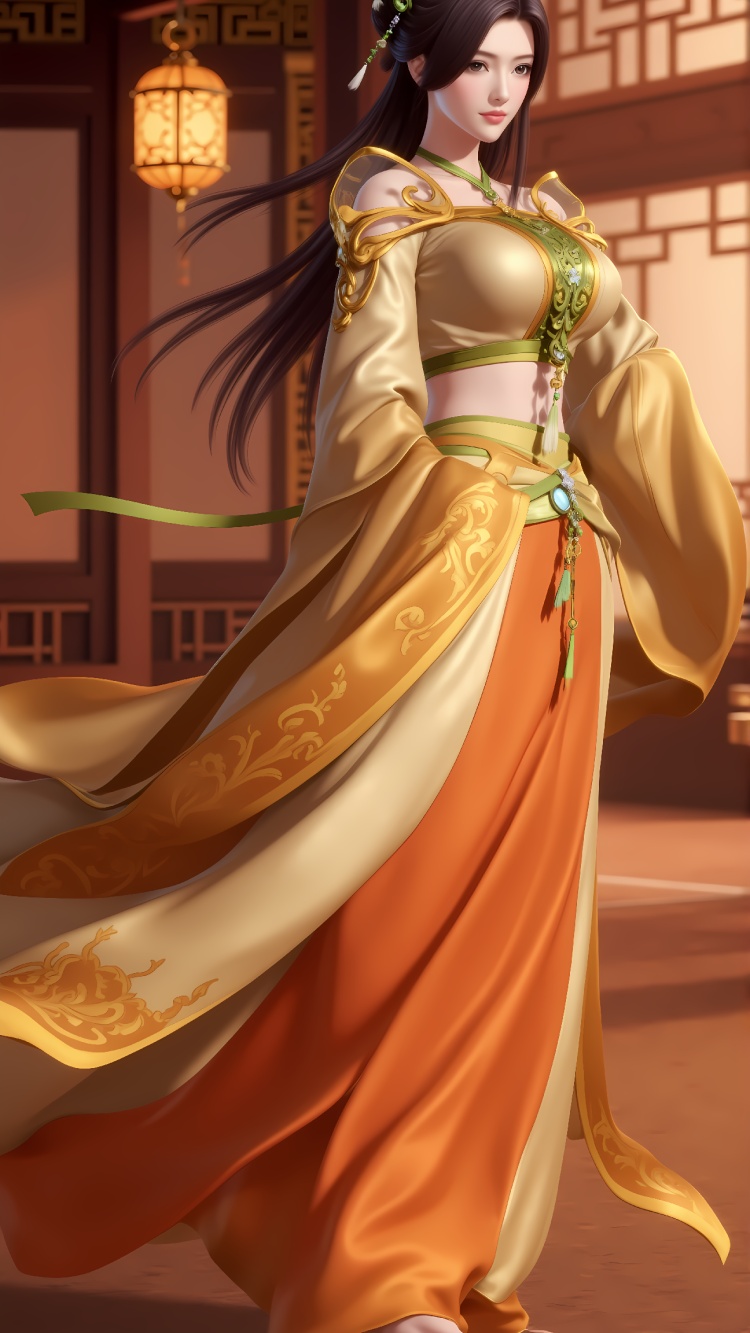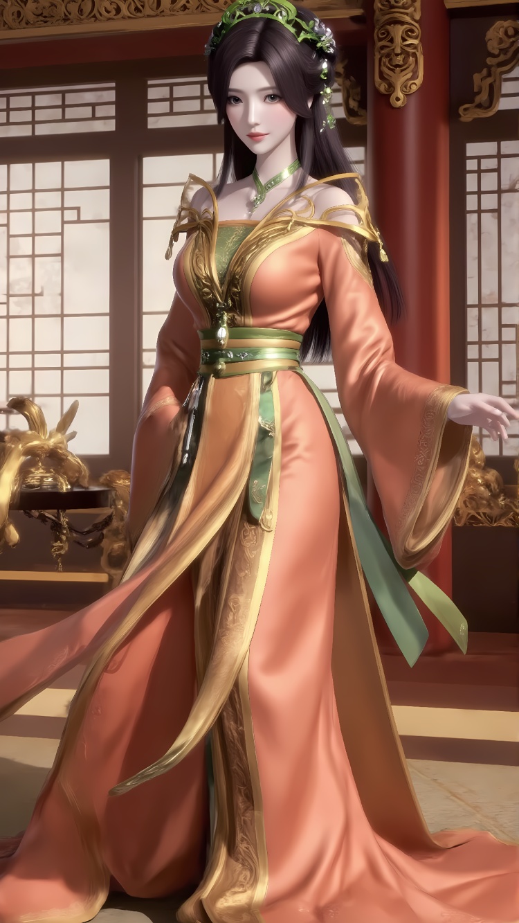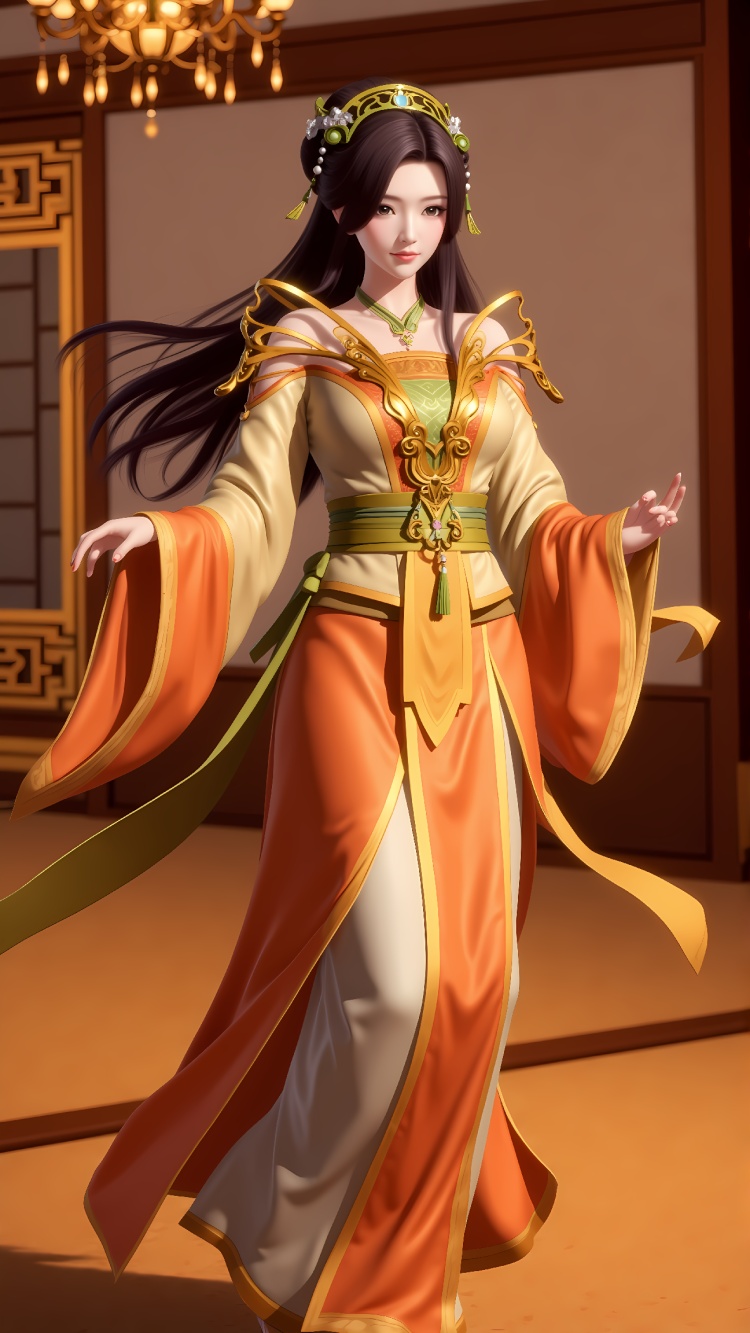 推荐提示词5:The image is a digital illustration of a woman in a traditional Chinese dress. She is standing in a room with ornate decorations and a chandelier hanging from the ceiling. The woman is wearing a long, flowing orange and gold dress with intricate gold embroidery on the bodice and skirt. The dress has a high neckline and long sleeves, and the skirt is flowing in the wind. She has long dark hair styled in loose waves and is wearing green and gold accessories on her head and shoulders. Her makeup is subtle and natural-looking, with a hint of pink blush on her cheeks. The overall mood of the image is elegant and regal.
