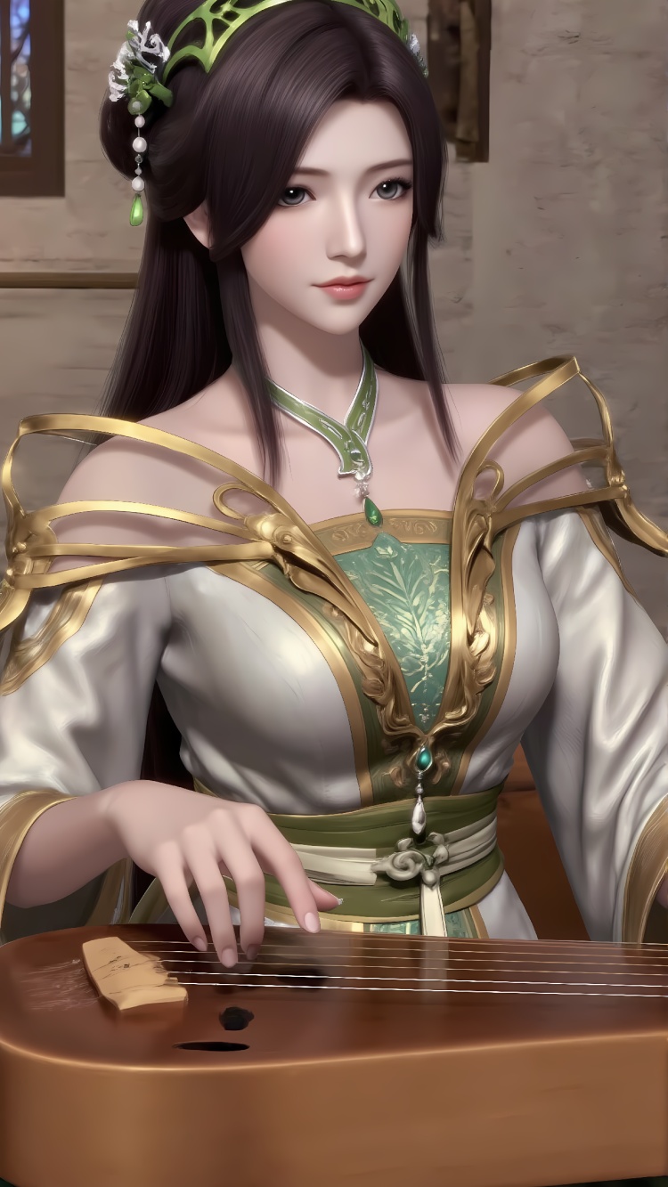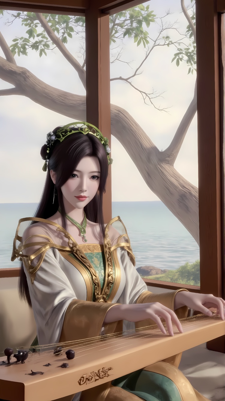 推荐提示词1:The image shows a young woman playing a musical instrument in a room with a large window. She is wearing a traditional Chinese outfit with a green and gold headpiece and a white robe. The woman has long dark hair and is holding the instrument with both hands. The instrument appears to be a stringed instrument with a long neck and a curved body. The background shows a tree and a body of water, suggesting that the room is located in a tropical or subtropical environment. The overall mood of the image is peaceful and serene.
