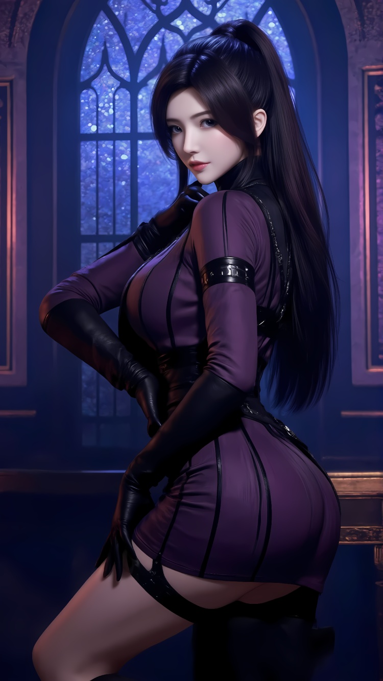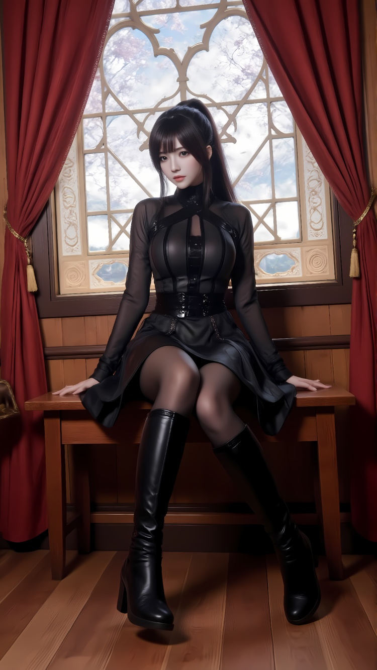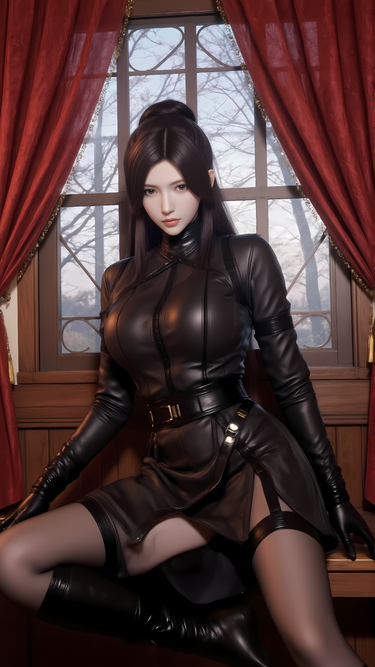 推荐提示词7黑衣:The image shows a young woman sitting on a wooden bench in front of a large window with red curtains. She is wearing a black leather outfit with a high neckline and long sleeves. The outfit has a high collar and is cinched at the waist with a black belt. She has long dark hair styled in a high bun and is wearing black gloves and boots. The woman is looking off to the side with a serious expression on her face. The window behind her has a wrought iron grille and there is a view of trees outside. The overall mood of the image is dark and mysterious.