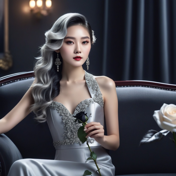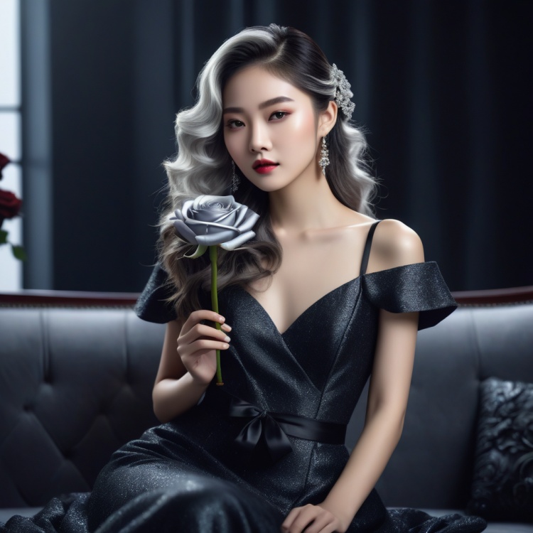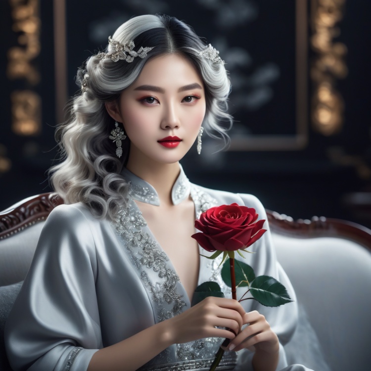 The Chinese girl is delicate and beautiful,with silver long curls,a strong sense of fashion,wearing Chanel clothing,sitting on a sofa holding a black rose,a clean background centered,with depth of field and lighting effects,4K,CG illustration style,