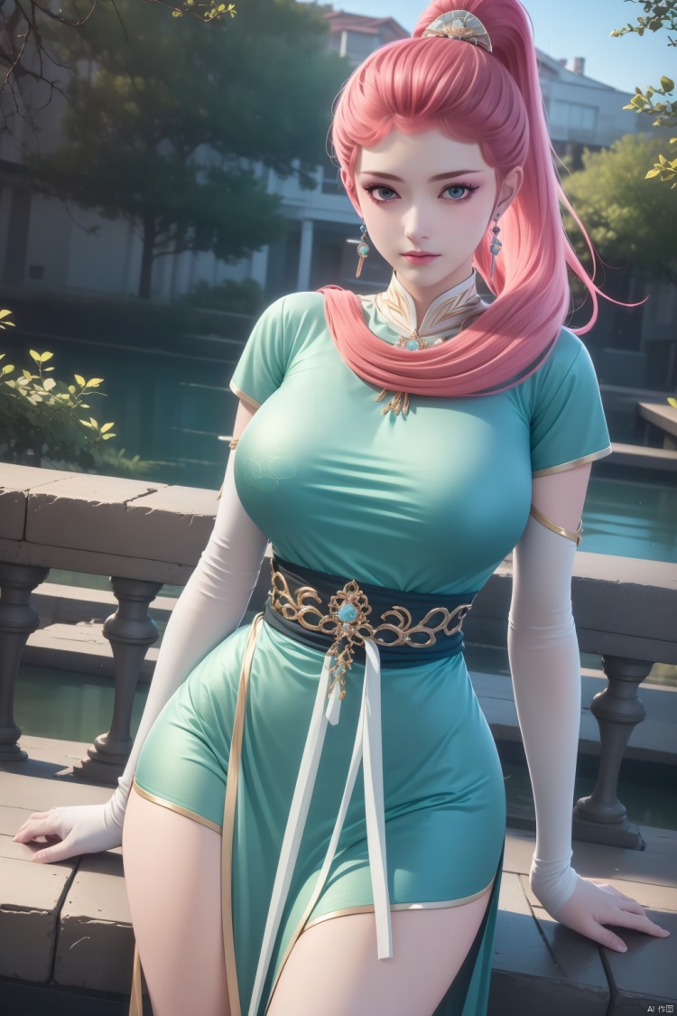 1girl, solo, long hair, breasts, looking at viewer, hair ornament, dress, jewelry, ponytail, pink hair, earrings, masterpiece,best quality,official art,extremely detailed CG unity 8k wallpaper,