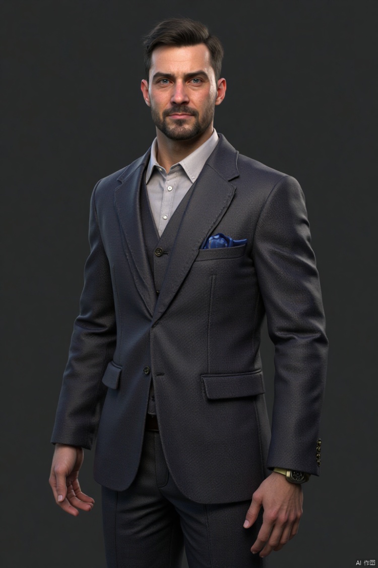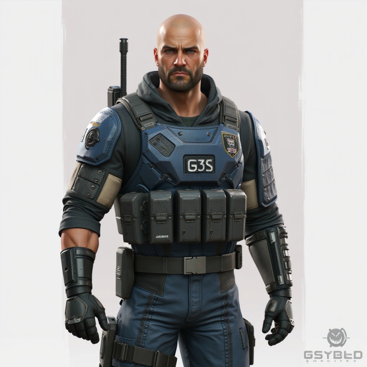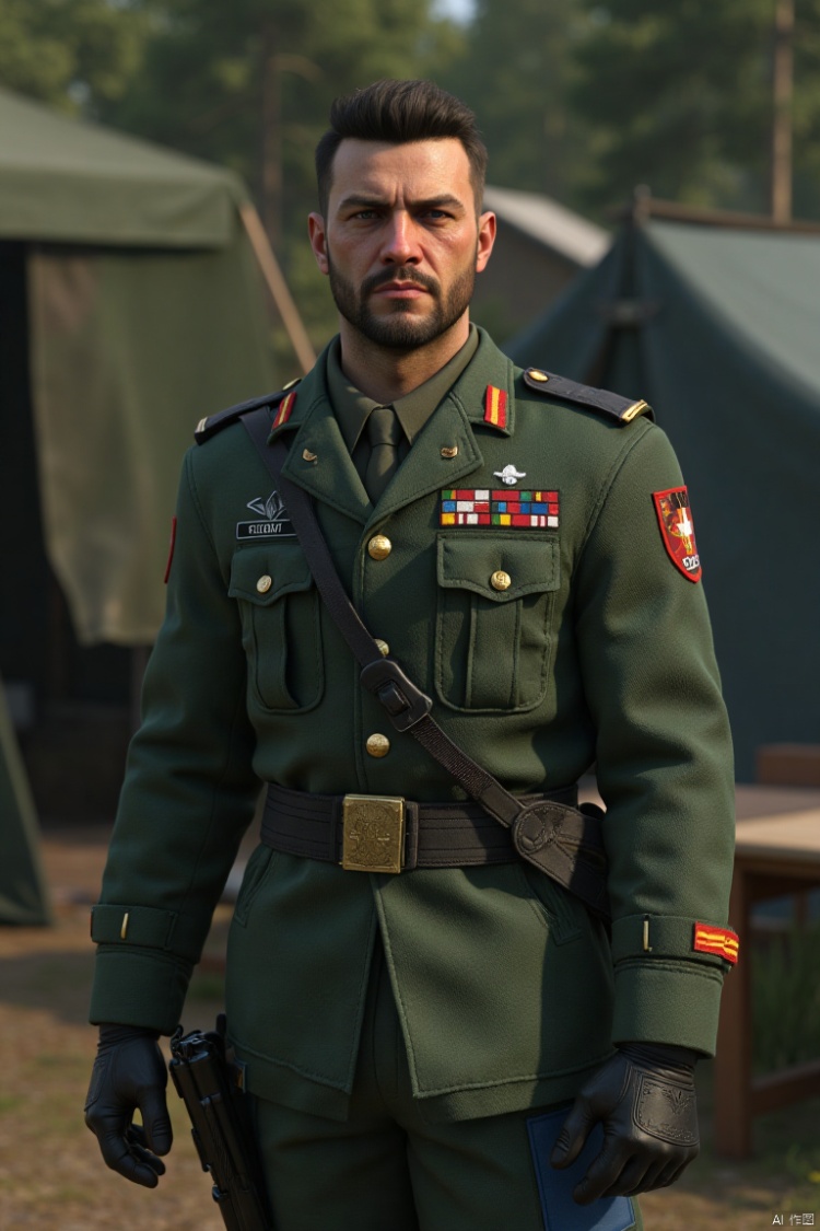 训练关键字:1man ,Game character,3D,the picture shows a male character in uniform, standing in a camp like scene ,and some miscellaneous items in the background ,His eyes were deep and sharp , The facial contour is tough Extremely charming,With a calm temperament