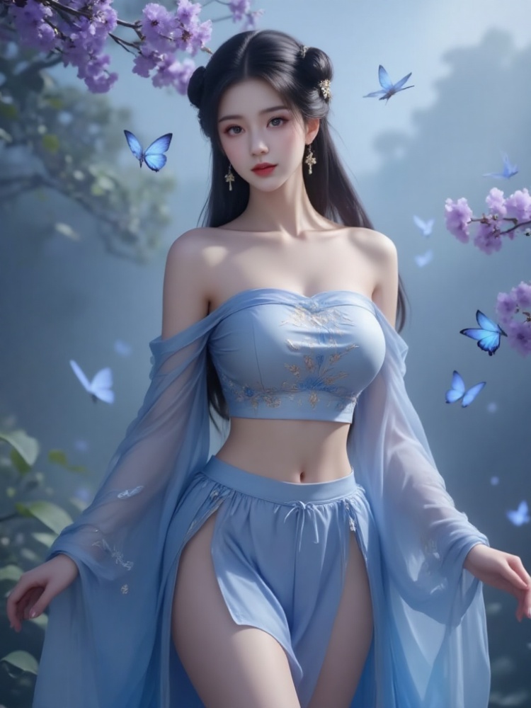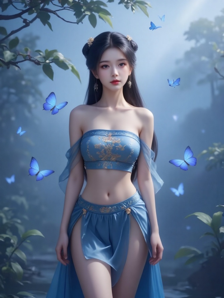 Masterpiece, the best quality, very high details, 8k, a girl, long black hair, bright eyes, exquisite facial features, super details. ((She is wearing a strapless embroidered silk bellyband with ancient rhyme), ((She is wearing a short skirt)), ((Her chest is full and straight, revealing deep and charming cleavage, which is sexy and attractive without losing beauty). Simple hairstyle, simple hair accessories, long legs, barefoot, without shoes, hands placed vertically at the sides of the body, perfect finger details, standing facing the viewer. The camera took a panoramic view of her whole body from a distance, focusing on the cleavage and beautiful legs of her upper body. Fairy fog fills the air in the background, and blue butterflies fly, emitting soft light. The overall effect is a beautiful dreamy vision in which reality and dreams are integrated. , distant portrait, (the top of the head is 0.2cm away from the upper edge of the screen), full-length portrait with perfect details, 8k image quality, perfect details and perfect fingers