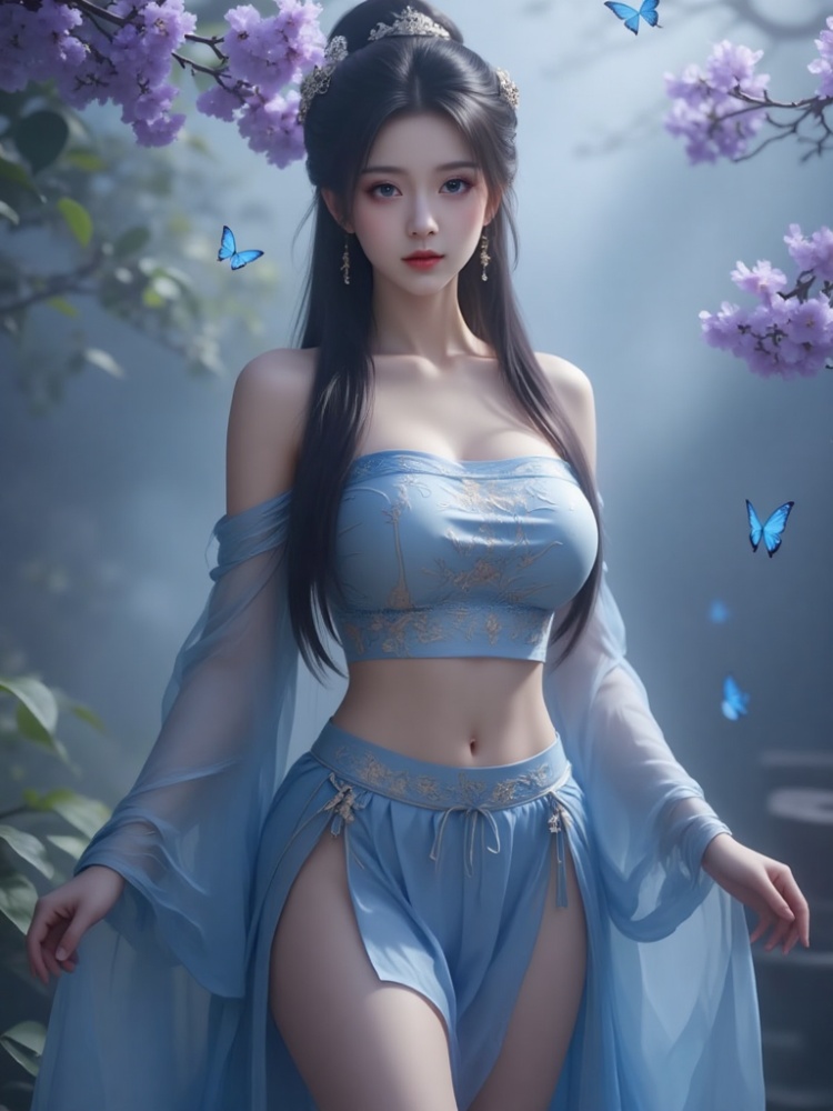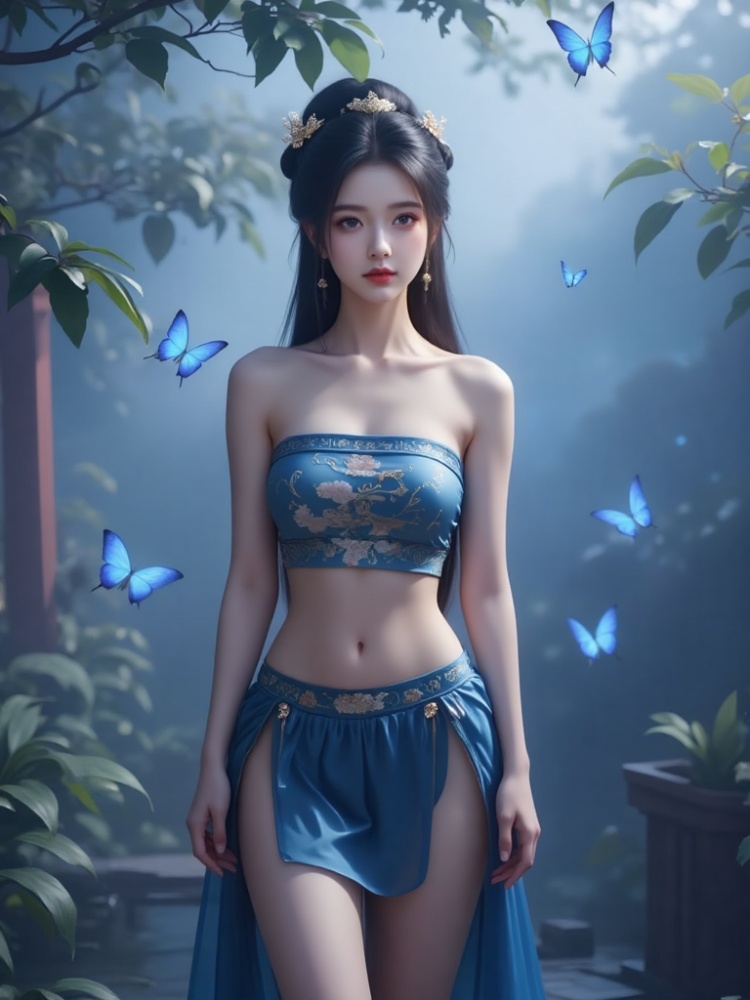 Masterpiece, the best quality, very high details, 8k, a girl, long black hair, bright eyes, exquisite facial features, super details. ((She is wearing a strapless embroidered silk bellyband with ancient rhyme), ((She is wearing a short skirt)), ((Her chest is full and straight, revealing deep and charming cleavage, which is sexy and attractive without losing beauty). Simple hairstyle, simple hair accessories, long legs, barefoot, without shoes, hands placed vertically at the sides of the body, perfect finger details, standing facing the viewer. The camera took a panoramic view of her whole body from a distance, focusing on the cleavage and beautiful legs of her upper body. Fairy fog fills the air in the background, and blue butterflies fly, emitting soft light. The overall effect is a beautiful dreamy vision in which reality and dreams are integrated. , distant portrait, (the top of the head is 0.2cm away from the upper edge of the screen), full-length portrait with perfect details, 8k image quality, perfect details and perfect fingers