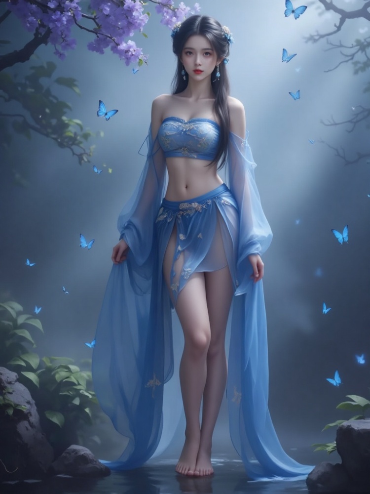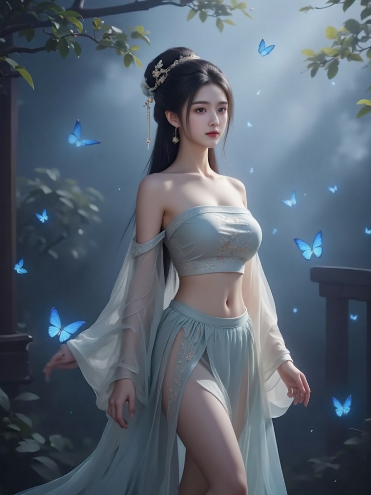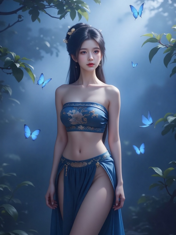 Masterpiece, the best quality, very high details, 8k, a girl, long black hair, bright eyes, exquisite facial features, super details. ((She is wearing a strapless embroidered silk bellyband with ancient rhyme), ((She is wearing a short skirt)), ((Her chest is full and straight, revealing deep and charming cleavage, which is sexy and attractive without losing beauty). Simple hairstyle, simple hair accessories, long legs, barefoot, without shoes, hands placed vertically at the sides of the body, perfect finger details, standing facing the viewer. The camera took a panoramic view of her whole body from a distance, focusing on the cleavage and beautiful legs of her upper body. Fairy fog fills the air in the background, and blue butterflies fly, emitting soft light. The overall effect is a beautiful dreamy vision in which reality and dreams are integrated. , distant portrait, (the top of the head is 0.2cm away from the upper edge of the screen), full-length portrait with perfect details, 8k image quality, perfect details and perfect fingers