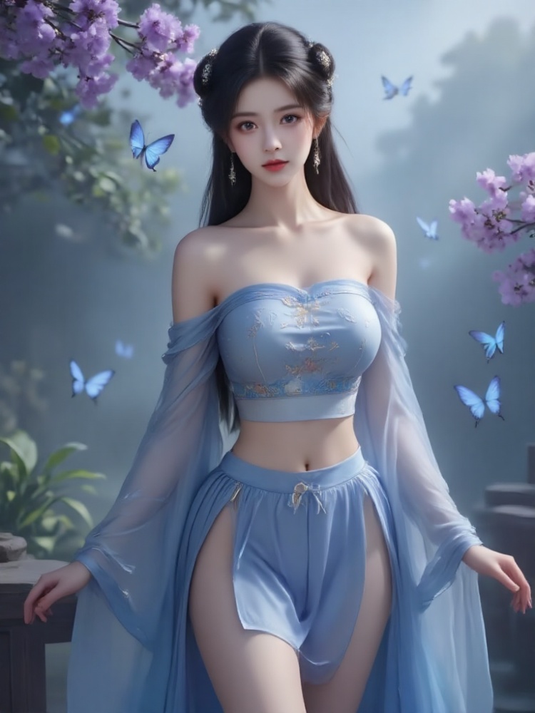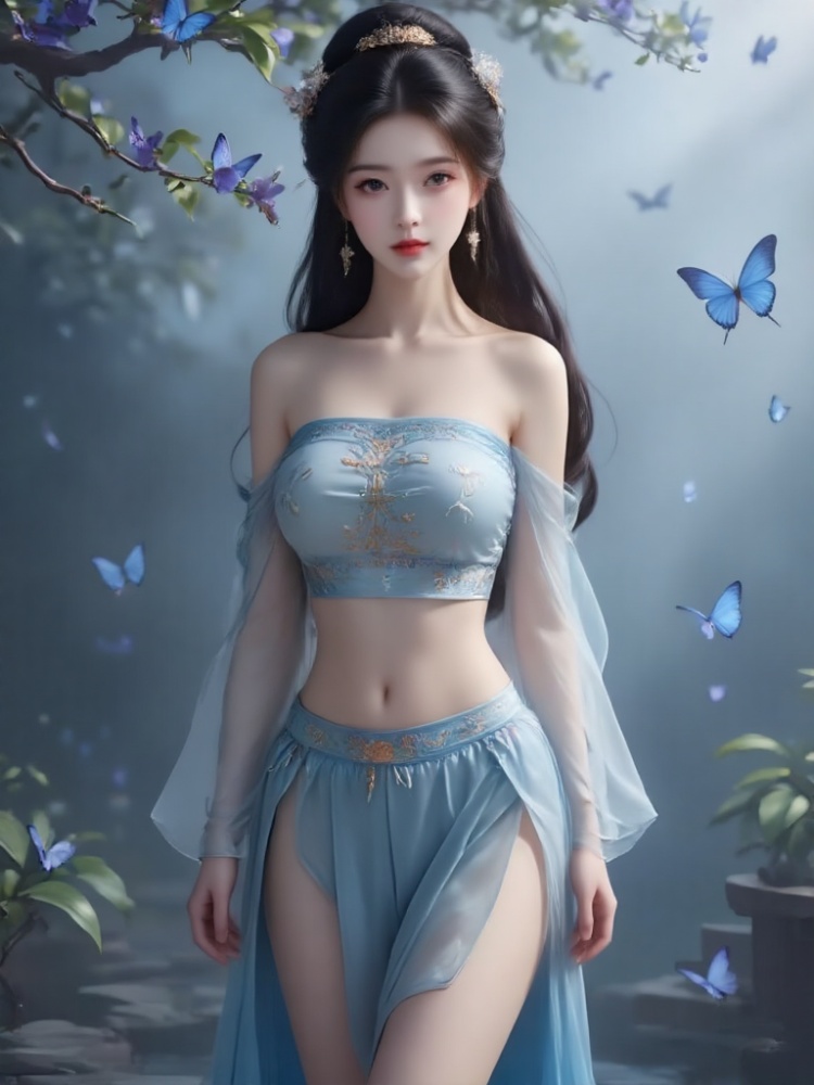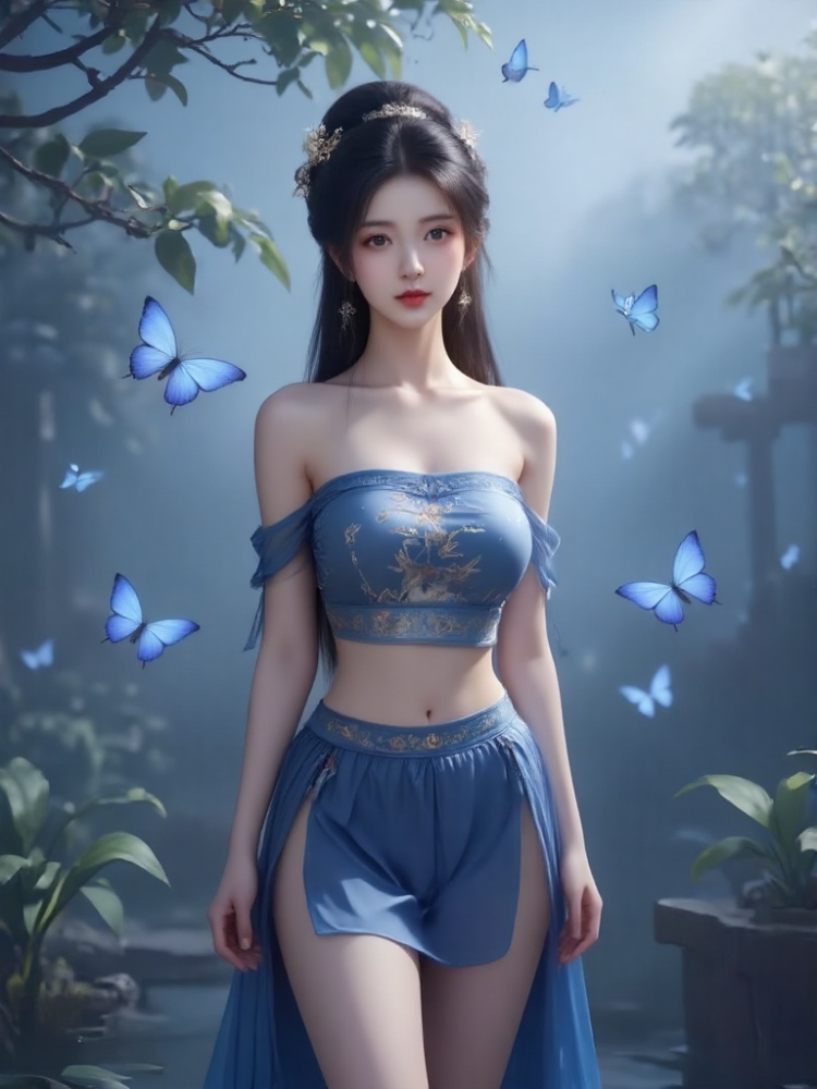Masterpiece, the best quality, very high details, 8k, a girl, long black hair, bright eyes, exquisite facial features, super details. ((She is wearing a strapless embroidered silk bellyband with ancient rhyme), ((She is wearing a short skirt)), ((Her chest is full and straight, revealing deep and charming cleavage, which is sexy and attractive without losing beauty). Simple hairstyle, simple hair accessories, long legs, barefoot, without shoes, hands placed vertically at the sides of the body, perfect finger details, standing facing the viewer. The camera took a panoramic view of her whole body from a distance, focusing on the cleavage and beautiful legs of her upper body. Fairy fog fills the air in the background, and blue butterflies fly, emitting soft light. The overall effect is a beautiful dreamy vision in which reality and dreams are integrated. , distant portrait, (the top of the head is 0.2cm away from the upper edge of the screen), full-length portrait with perfect details, 8k image quality, perfect details and perfect fingers