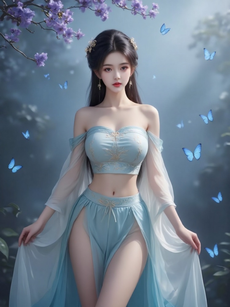Masterpiece, the best quality, very high details, 8k, a girl, long black hair, bright eyes, exquisite facial features, super details. ((She is wearing a strapless embroidered silk bellyband with ancient rhyme), ((She is wearing a short skirt)), ((Her chest is full and straight, revealing deep and charming cleavage, which is sexy and attractive without losing beauty). Simple hairstyle, simple hair accessories, long legs, barefoot, without shoes, hands placed vertically at the sides of the body, perfect finger details, standing facing the viewer. The camera took a panoramic view of her whole body from a distance, focusing on the cleavage and beautiful legs of her upper body. Fairy fog fills the air in the background, and blue butterflies fly, emitting soft light. The overall effect is a beautiful dreamy vision in which reality and dreams are integrated. , distant portrait, (the top of the head is 0.2cm away from the upper edge of the screen), full-length portrait with perfect details, 8k image quality, perfect details and perfect fingers