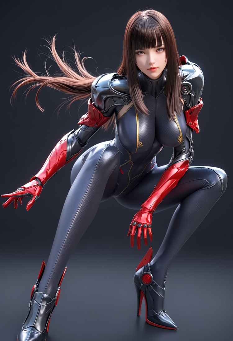 1girl,solo,brown_eyes,bodysuit,shoulder armor,long hair,black hair,breasts,multicolored bodysuit,covered navel,looking at viewer,closed mouth,armor,simple background,skin_tight,standing,huge_breasts,lips,science fiction,cyborg,chinese character,sitting,