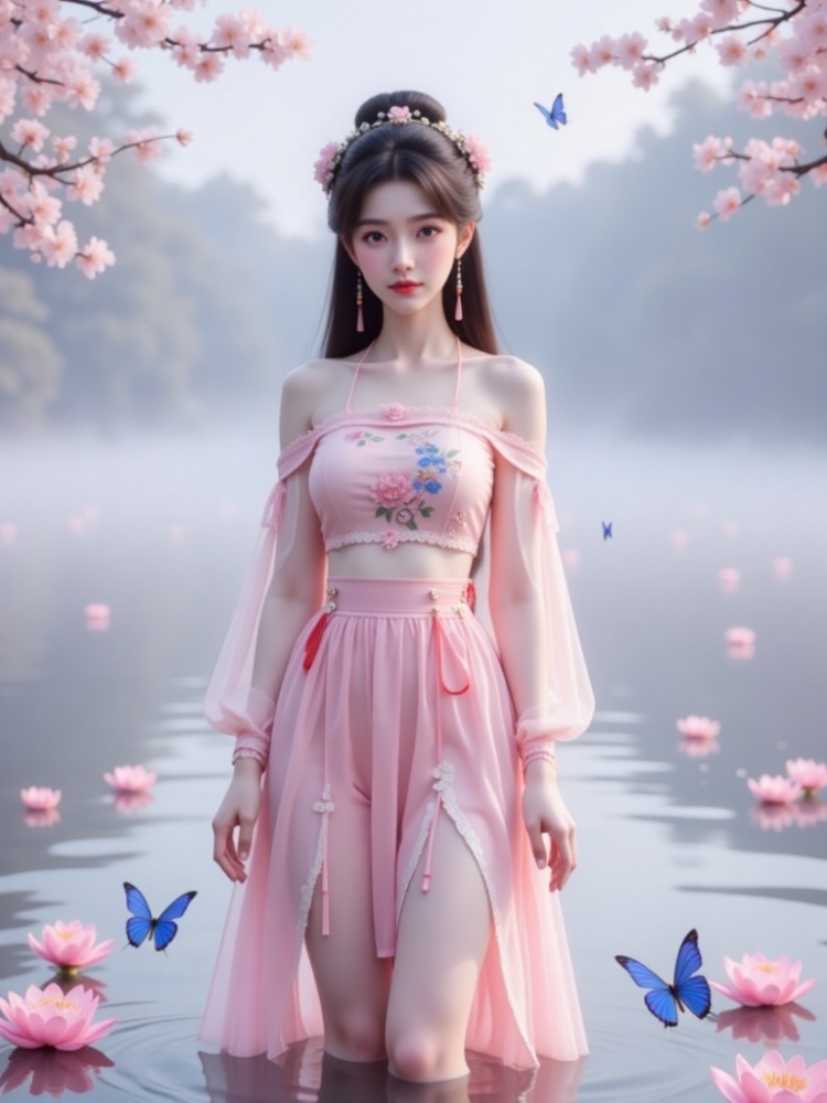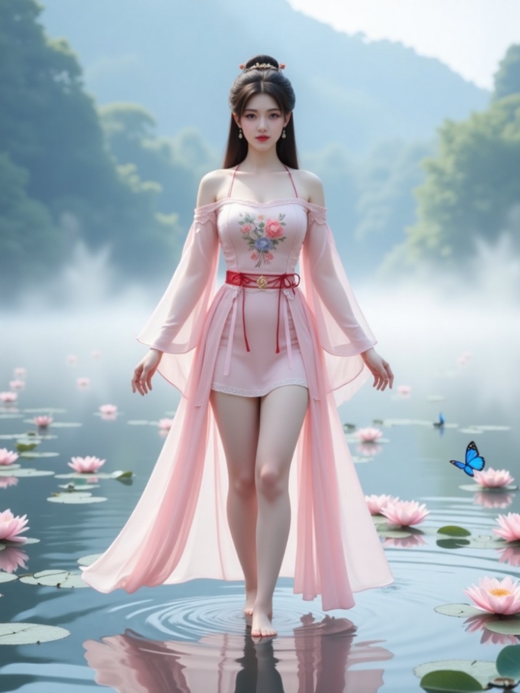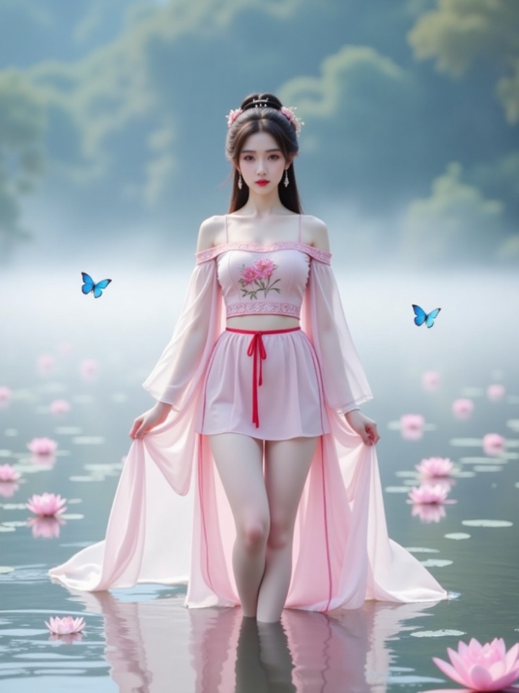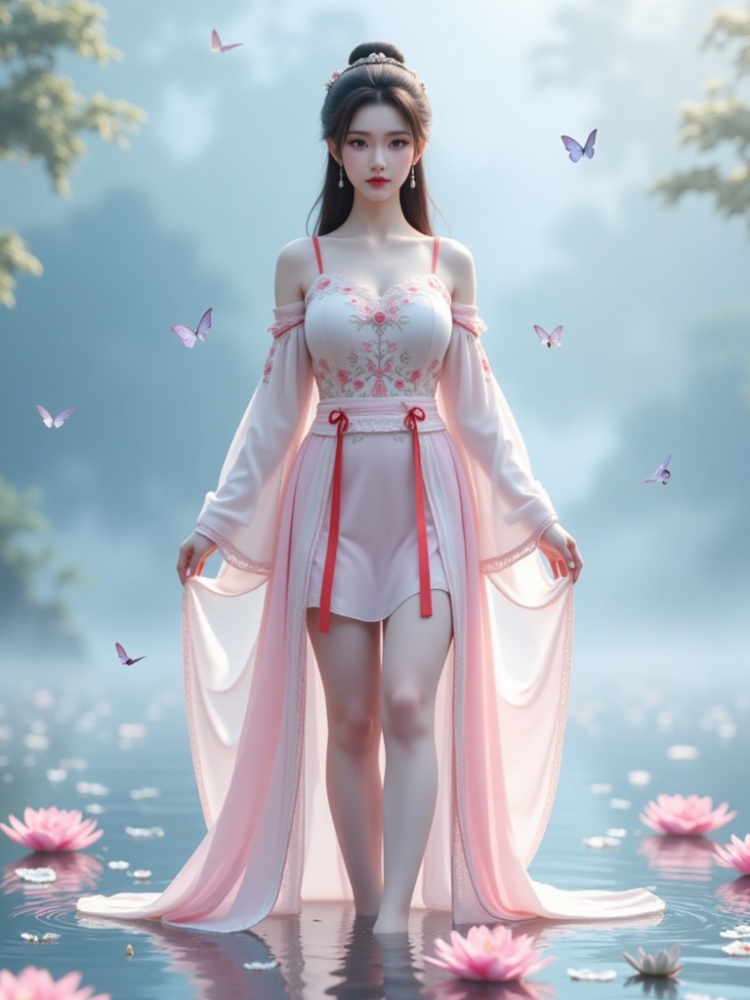1 girl, with long hair, simple hairstyle, simple hair accessories, earrings, bun, hairpin, exquisite facial features, gentle expression, ("she wears different kinds of clothes") standing on the water, surrounded by a small number of pink lotus flowers and blue butterflies. There are the following types of clothing: 1. Elegant "off-the-shoulder dress" embroidered with delicate flowers, (decorated with complicated lace details and red ribbons), (revealing two slender legs) and (wearing "stockings" on the legs). 2. ("tight-fitting, suspender hip skirt") or strapless ("hip skirt"), (legs wearing "stockings"). 3. (("Gu Yun Chinese-style chest covering"), ("Gu Yun tube top"), Gu Yun tulle skirt, (legs wearing "stockings"). 4. ("modern" tube top), "hip skirt"), (legs wearing "stockings"). ("Show two slender legs"), (Legs are wearing "stockings"), ("stockings" have delicate lace details, and "stockings" have soft surface texture). (barefoot without shoes), the composition is eye-catching. The background is filled with fairy fog, and the overall effect is a beautiful dreamy vision combining reality and dreams. Such as Yaochi Fairy. (("Her breasts are full and straight"), "Showing charming cleavage"), "The breasts are coming out soon"), "Sexy and attractive without losing beauty". Hands perpendicular to the sides of the body, looking at the audience, (the camera took a panoramic view of her whole body from a distance, "the focus is on her upper body cleavage and beautiful legs"). Long-distance shooting, ("panoramic lens"), ultra-high detail, ultra-high resolution, 32K UHD, best picture quality, masterpiece, exquisite detail, ultra-realism, high dynamic range, epic realism and ultra-perfect finger details.