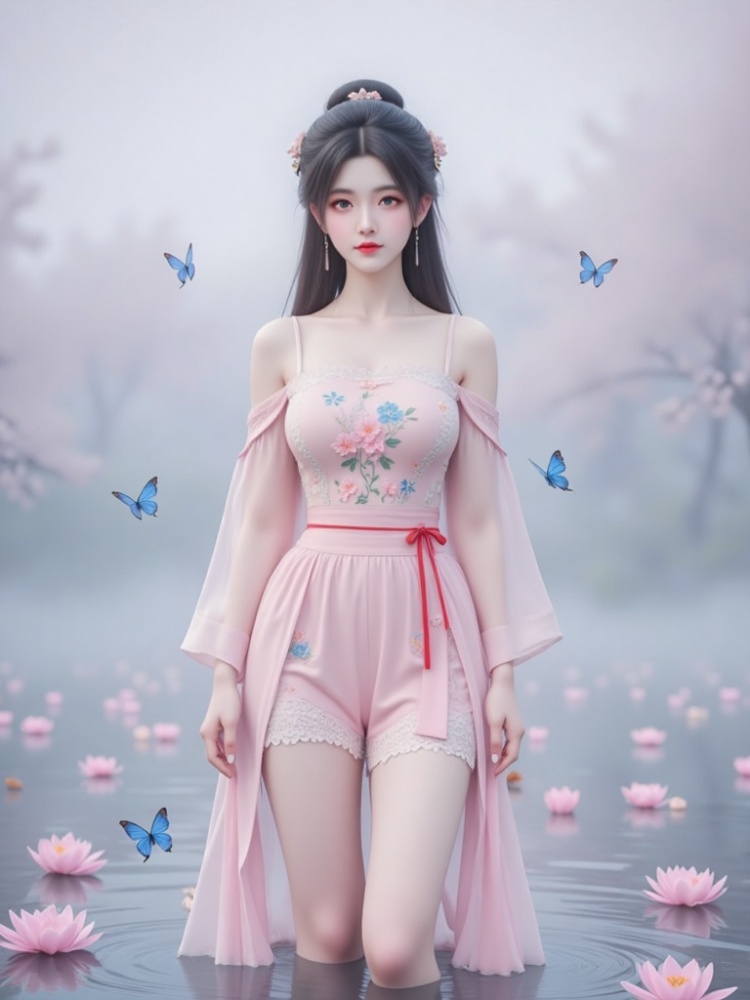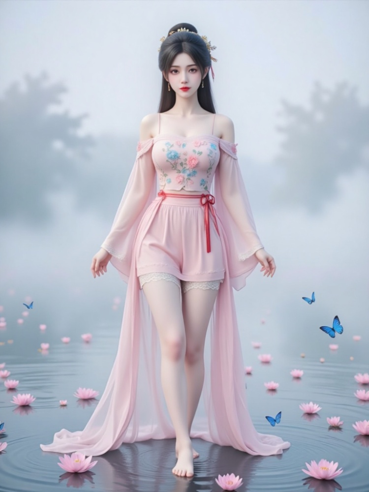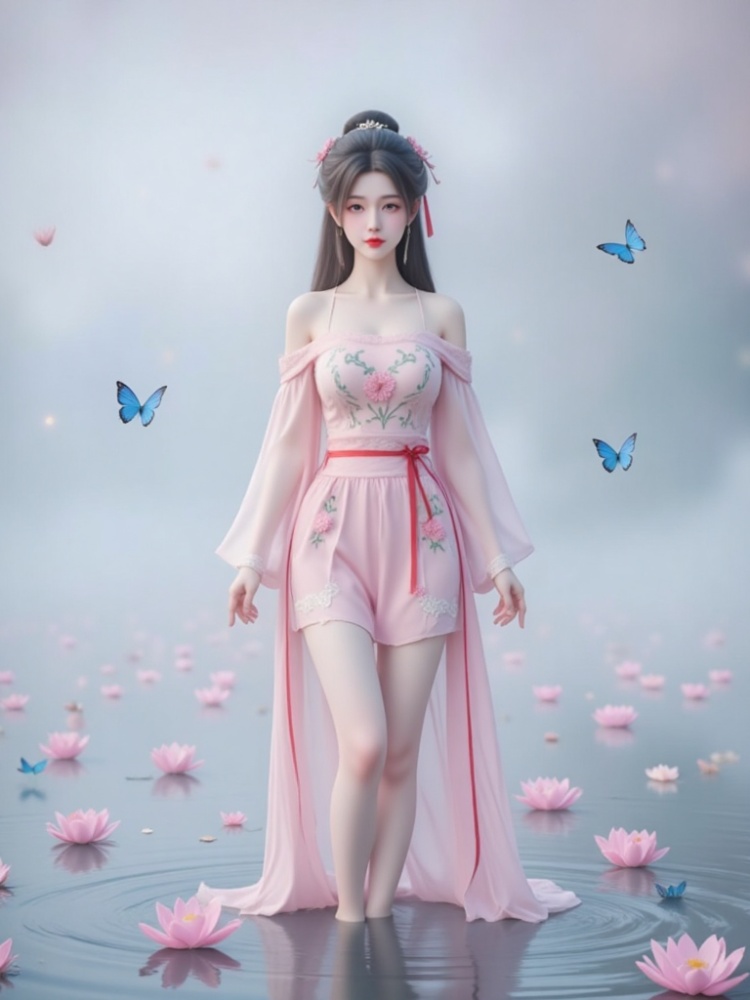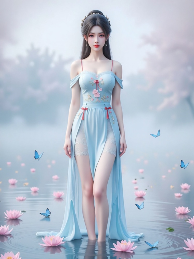 1 girl, with long hair, simple hairstyle, simple hair accessories, earrings, bun, hairpin, exquisite facial features, gentle expression, ("she wears different kinds of clothes") standing on the water, surrounded by a small number of pink lotus flowers and blue butterflies. There are the following types of clothing: 1. Elegant "off-the-shoulder dress" embroidered with delicate flowers, (decorated with complicated lace details and red ribbons), (revealing two slender legs) and (wearing "stockings" on the legs). 2. ("tight-fitting, suspender hip skirt") or strapless ("hip skirt"), (legs wearing "stockings"). 3. (("Gu Yun Chinese-style chest covering"), ("Gu Yun tube top"), Gu Yun tulle skirt, (legs wearing "stockings"). 4. ("modern" tube top), "hip skirt"), (legs wearing "stockings"). ("Show two slender legs"), (Legs are wearing "stockings"), ("stockings" have delicate lace details, and "stockings" have soft surface texture). (barefoot without shoes), the composition is eye-catching. The background is filled with fairy fog, and the overall effect is a beautiful dreamy vision combining reality and dreams. Such as Yaochi Fairy. (("Her breasts are full and straight"), "Showing charming cleavage"), "The breasts are coming out soon"), "Sexy and attractive without losing beauty". Hands perpendicular to the sides of the body, looking at the audience, (the camera took a panoramic view of her whole body from a distance, "the focus is on her upper body cleavage and beautiful legs"). Long-distance shooting, ("panoramic lens"), ultra-high detail, ultra-high resolution, 32K UHD, best picture quality, masterpiece, exquisite detail, ultra-realism, high dynamic range, epic realism and ultra-perfect finger details.