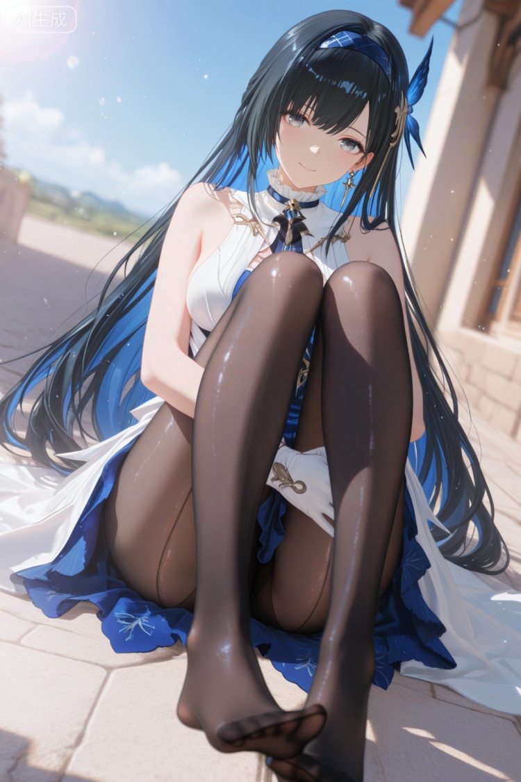 selena,1girl, solo, long hair, breasts, bangs,grey eyes, black hair, hair ornament, gloves, dress, bare shoulders, blue hair, flower, multicolored hair,hairband, sleeveless, white gloves, two-tone hair, colored inner hair,