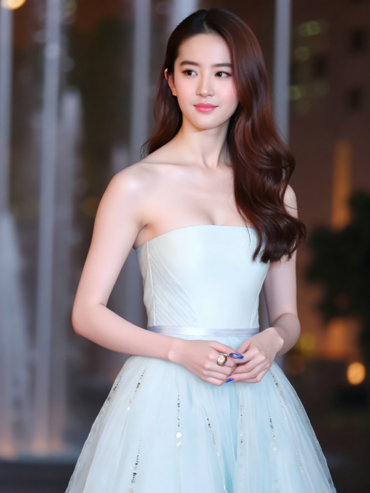 (Masterpiece, Ultimate Details, Best Quality: 1.2, Super Realistic: 1.4), (Facial Details: 1.4, Hair Details, Clear Portrait, Correct Perspective), Girl, liuyifei,cleavage,Long hair, medium breasts, fair skin, d cup size, indoor, low cut dress, Blue and white strapless long skirt, (perfect body, full body structure, nine point portrait: 1.4, not half body portrait),soft breasts
