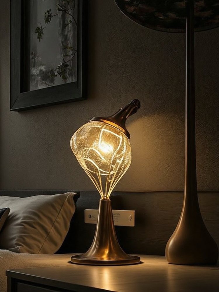 提示词:Night light design,The image depicts a nightstand with a dragon figurine perched on top. The dragon has large,pinkish wings and is positioned on a glowing pink orb that emits a warm light. The nightstand is wooden and has a drawer with a knob. The background includes a bed with white sheets and pillows,and the room is illuminated by a soft,blue-purple light,giving it a mystical ambiance. The overall setting suggests a cozy,fantasy-themed bedroom.