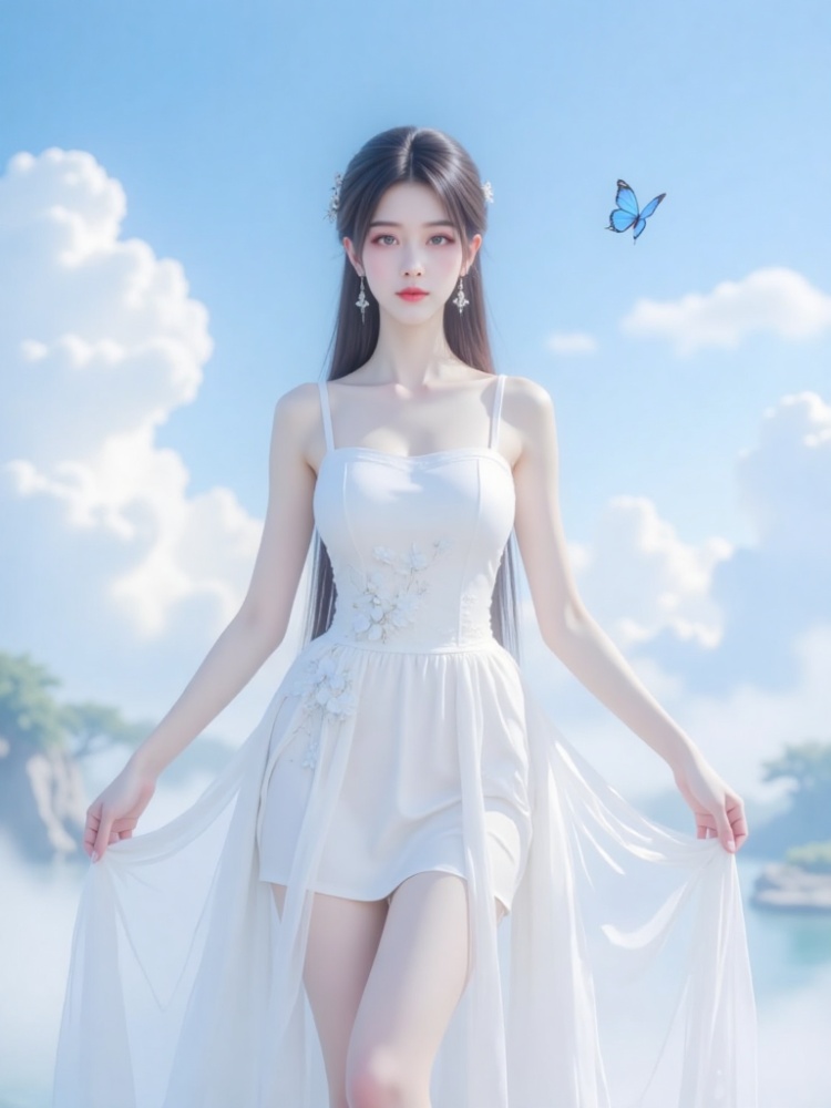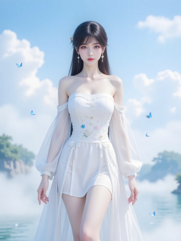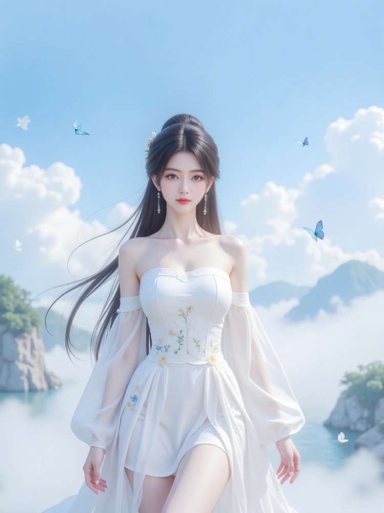 1 girl, Pedal Xiangyun, there are a few butterflies around. Extremely long hair, ((long hair knee-length)), Long hair fluttering. simple hairstyle, simple hair accessories, earrings, bun, hairpin, exquisite facial features, gentle expression, she wears ((Elegant white sling off-the-shoulder ceremony-clothing, It has embroidery on it)), ((Elegant tube top dress,It has embroidery on it)), ((An elegant “strapless” dress, It has embroidery on it)). ((white strapless dress embroidered with exquisite flowers)). Skirt knee-high, strapless, bright and clean Neck, show collarbone、big breasts、cleavage, fair skin。reveals two (super-long) beautiful legs,Wearing jacquard stockings on her legs,There is delicate lace "lace" on the upper end of the stockings. (barefoot without shoes),Expose jade-foot, (("her breasts are full and straight"), "revealing charming cleavage"), "sexy and attractive without losing beauty" ,The composition is striking. Fairy fog fills the air in the background, with blue sky and white clouds, emitting soft light. The overall effect is a beautiful dreamy vision that combines reality and dreams. Like the "fairy coming down to earth" in Yaochi, she shows her gentleness and femininity to the fullest,Her hands are perpendicular to her sides, Looking at the audience。(the camera took a panoramic portrait of her whole body from a distance, "the focus is on the cleavage and beautiful legs of her upper body"). And the overall effect is a beautiful dreamy vision that combines reality with dreams. Very long-distance shooting, ("panoramic lens"), ultra-high detail, ultra-high resolution, 32K, best picture quality, masterpiece, exquisite detail, ultra-realism, epic realism, and ultra-perfect finger details.