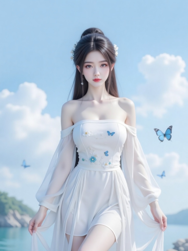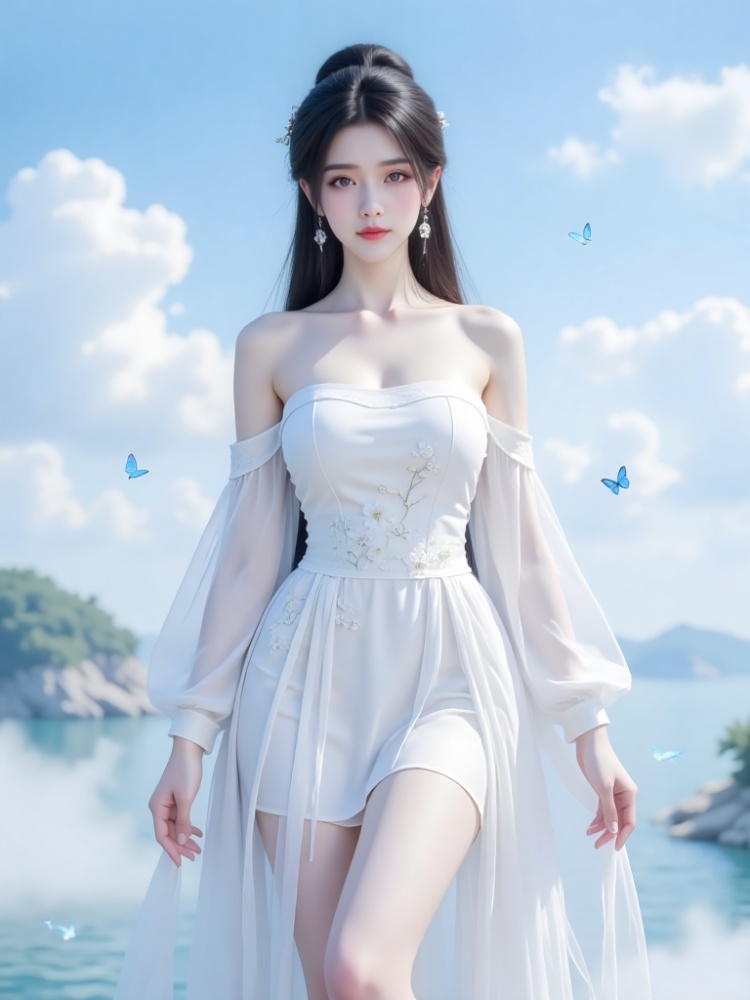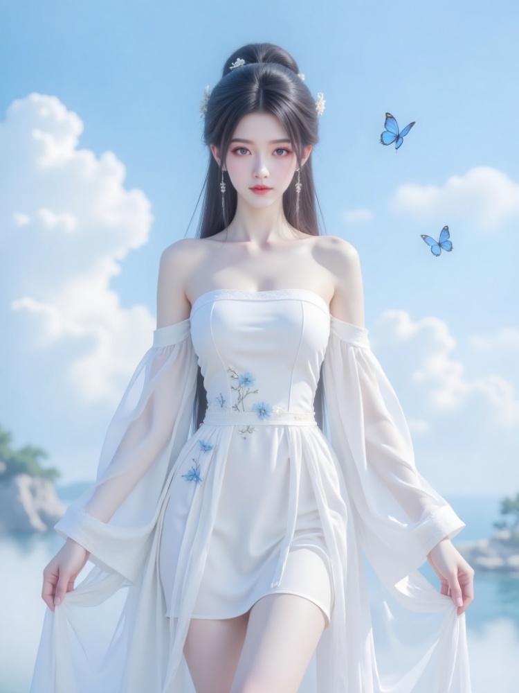 1 girl, Pedal Xiangyun, there are a few butterflies around. Extremely long hair, ((long hair knee-length)), Long hair fluttering. simple hairstyle, simple hair accessories, earrings, bun, hairpin, exquisite facial features, gentle expression, she wears ((Elegant white sling off-the-shoulder ceremony-clothing, It has embroidery on it)), ((Elegant tube top dress,It has embroidery on it)), ((An elegant “strapless” dress, It has embroidery on it)). ((white strapless dress embroidered with exquisite flowers)). Skirt knee-high, strapless, bright and clean Neck, show collarbone、big breasts、cleavage, fair skin。reveals two (super-long) beautiful legs,Wearing jacquard stockings on her legs,There is delicate lace "lace" on the upper end of the stockings. (barefoot without shoes),Expose jade-foot, (("her breasts are full and straight"), "revealing charming cleavage"), "sexy and attractive without losing beauty" ,The composition is striking. Fairy fog fills the air in the background, with blue sky and white clouds, emitting soft light. The overall effect is a beautiful dreamy vision that combines reality and dreams. Like the "fairy coming down to earth" in Yaochi, she shows her gentleness and femininity to the fullest,Her hands are perpendicular to her sides, Looking at the audience。(the camera took a panoramic portrait of her whole body from a distance, "the focus is on the cleavage and beautiful legs of her upper body"). And the overall effect is a beautiful dreamy vision that combines reality with dreams. Very long-distance shooting, ("panoramic lens"), ultra-high detail, ultra-high resolution, 32K, best picture quality, masterpiece, exquisite detail, ultra-realism, epic realism, and ultra-perfect finger details.
