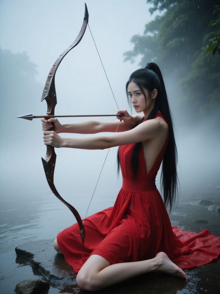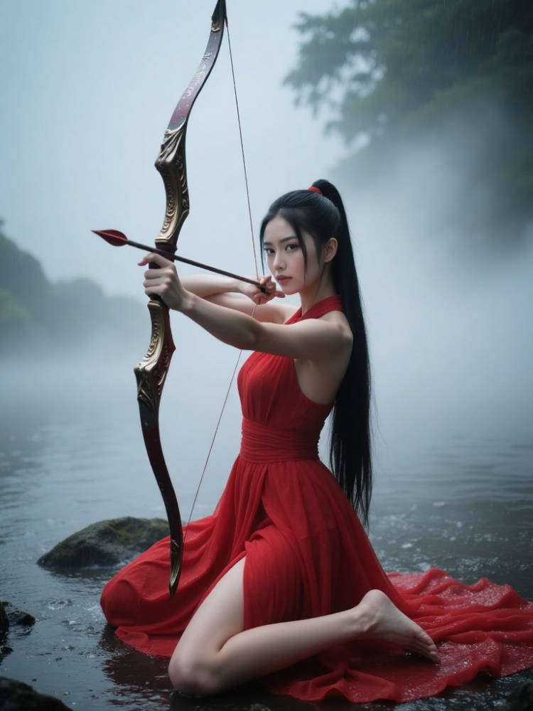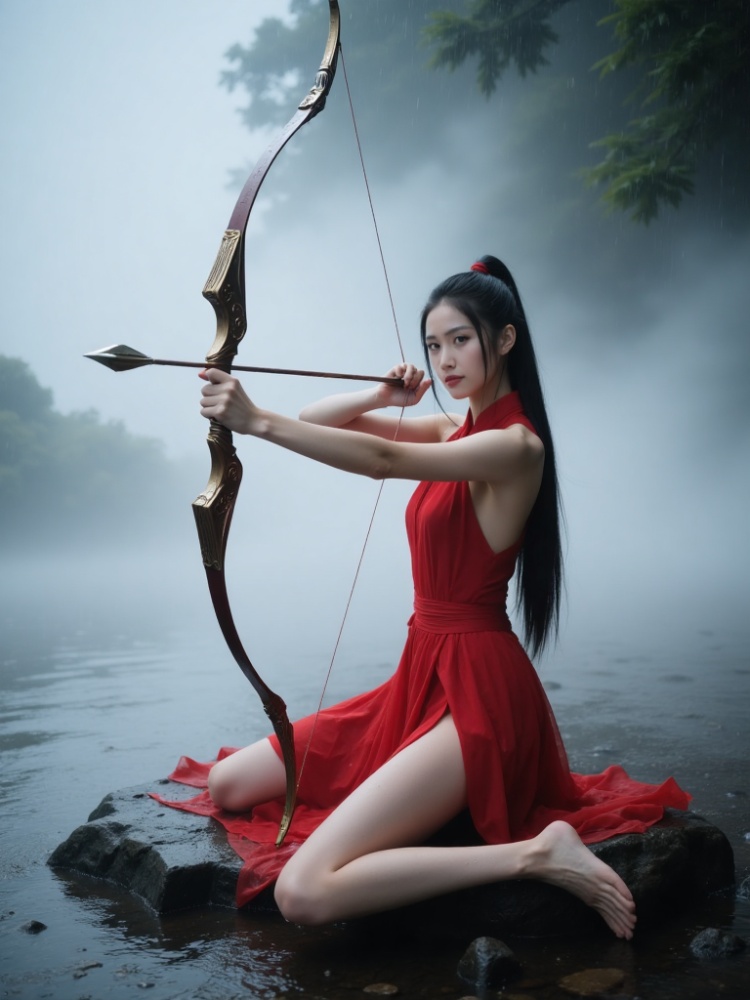 a woman dressed in a red sleeveless dress is seated on a rock, holding a bow and arrow in her hands. The woman's hair is pulled back in a ponytail, adding a touch of color to her outfit. The backdrop, a body of water, a tree, and a cloudy sky can be seen in the upper right corner of the frame.