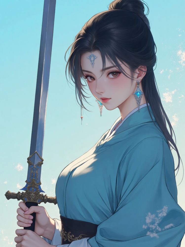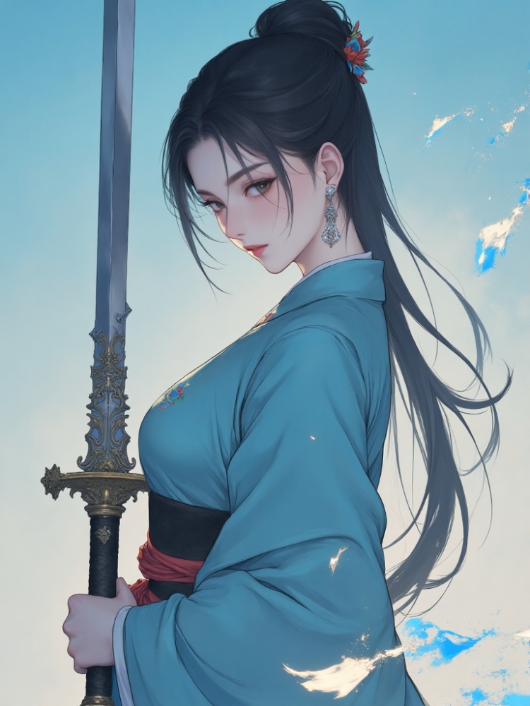 a medium-sized portrait of a Asian woman, dressed in a blue kimono, is holding a sword in her right hand. Her left hand is draped over her left shoulder, adding a touch of warmth to the scene. The woman's hair is pulled back in a bun, cascading down to her right shoulder. She is wearing a pair of silver earrings, and her left earring is adorned with a small stud in the middle of her earring. The backdrop is a light blue, creating a striking contrast with the woman and the sword.