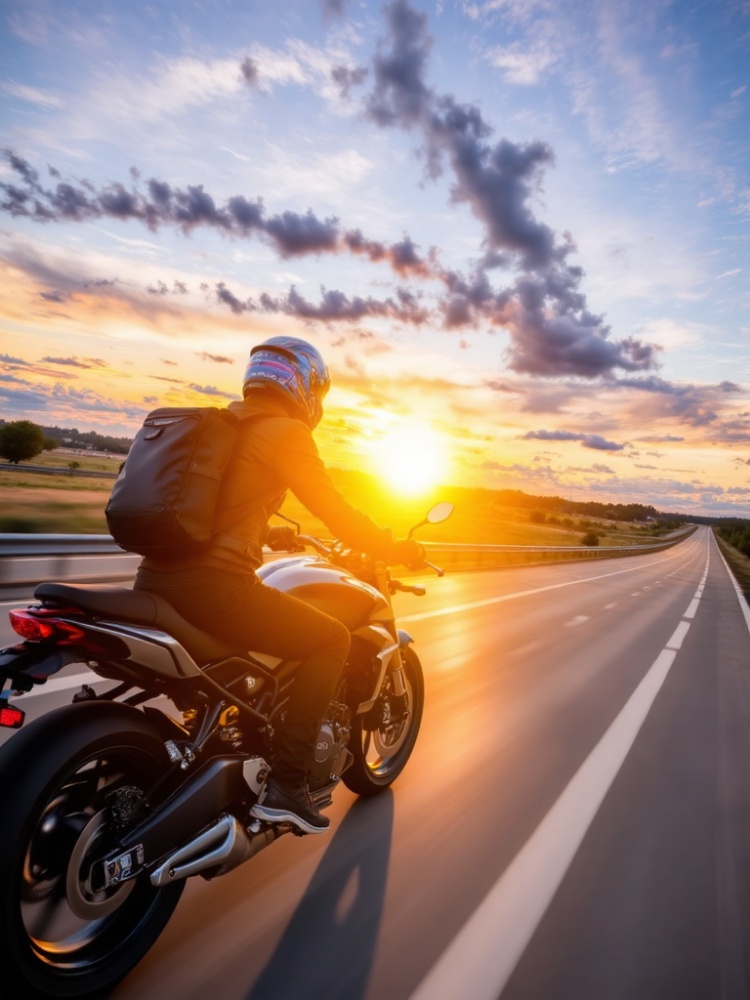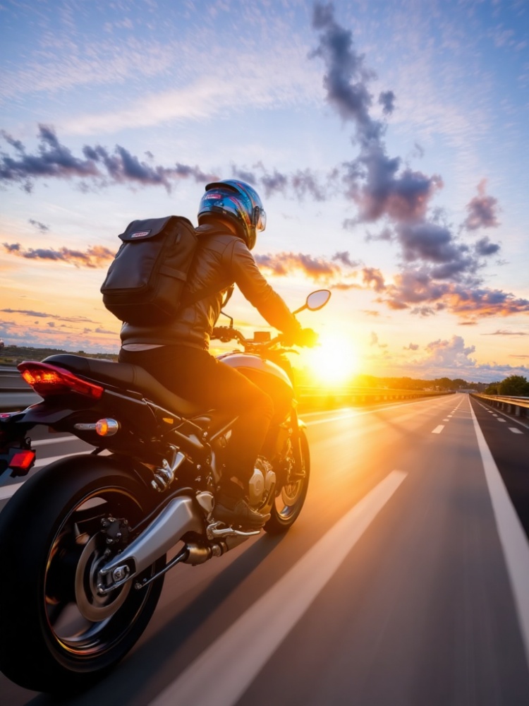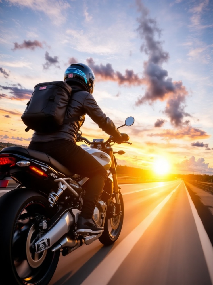 a motorcyclist, wearing a helmet, is seen riding a motorcycle down a road at sunset. The motorcycle is adorned with a black leather jacket and black pants. The rider is wearing a black helmet with a blue stripe on the side, and a black bag on the back of the motorcycle. The sun is setting in the background, and the sky is a deep blue, with a few wispy clouds, adding a touch of color to the scene.