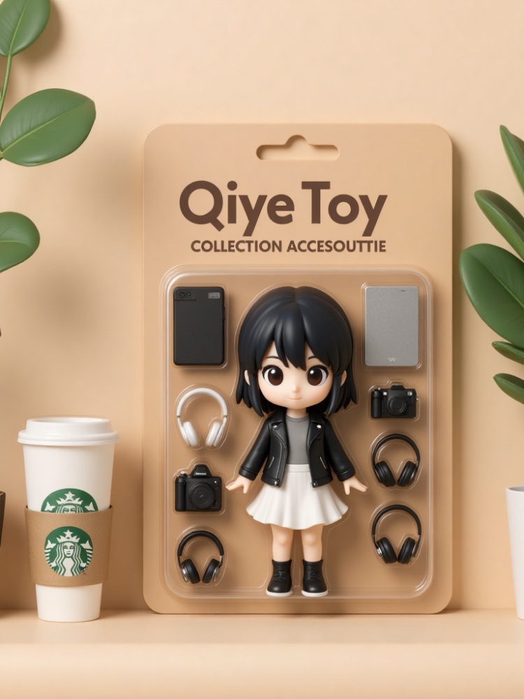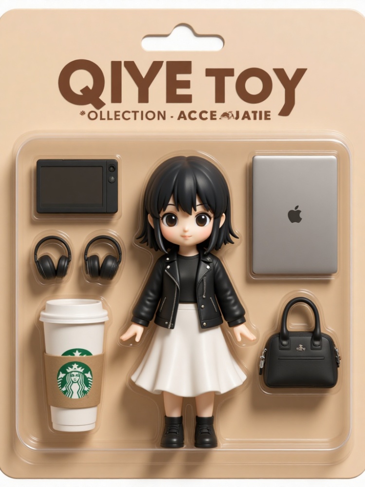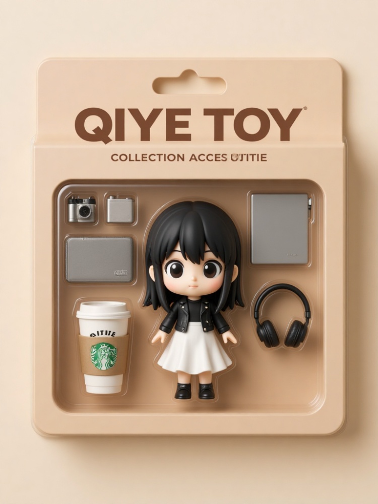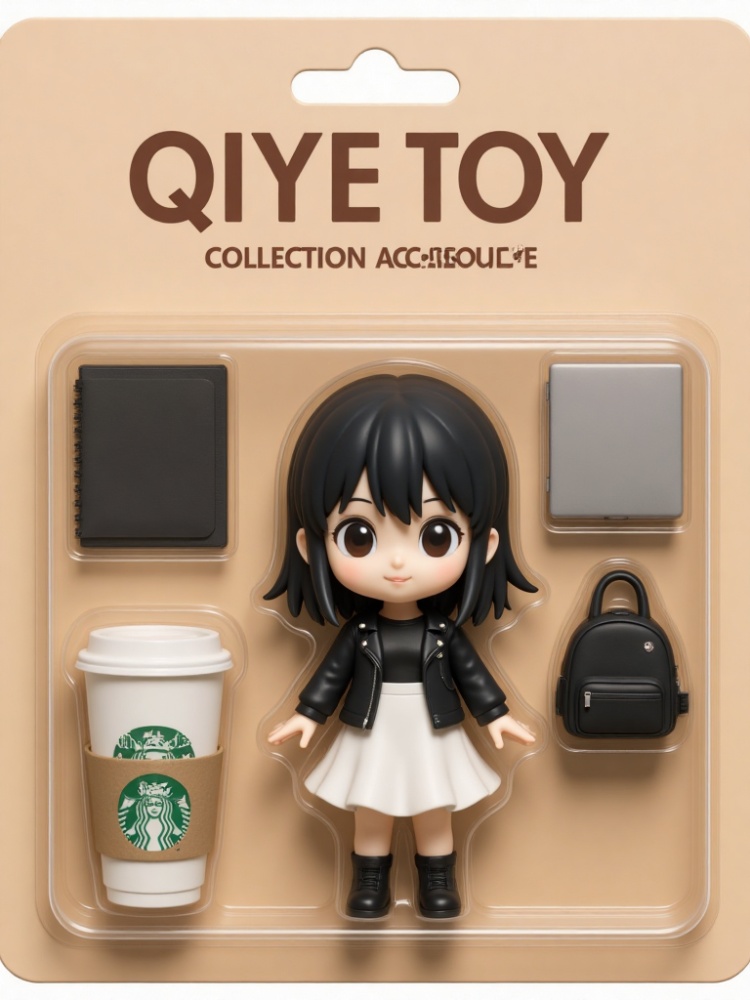 a small figurine of an anime girl is encased in a light brown cardboard box, adorned with the words "QIYE TOY COLLECTION ACCESOUTIE" in bold black letters. The figurine is a small, cartoon-like figure with long black hair, a black leather jacket, a white skirt, and black shoes. To the left of the figurine, there is a white coffee cup with the Starbucks logo on it. The coffee cup is placed in a cardboard holder, adding a pop of color to the scene.