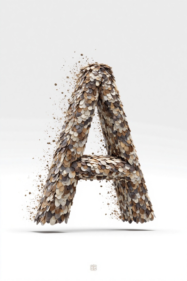 特征:材质质感为核心,展示了多种材质的立体字母和数字,富有创意和视觉冲击力。