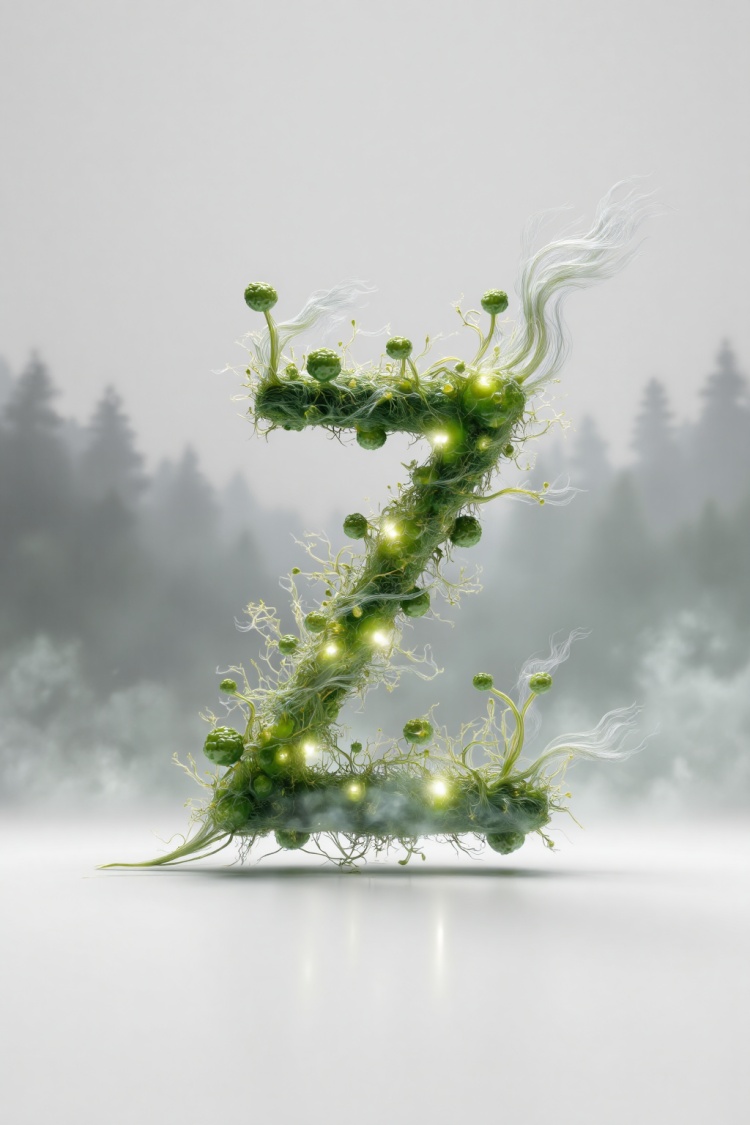 发出生物荧光的真菌菌丝网络,在雾气中散发柔和绿色光芒的细长丝。