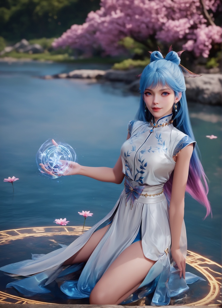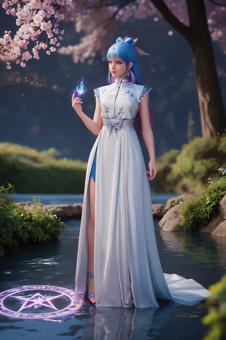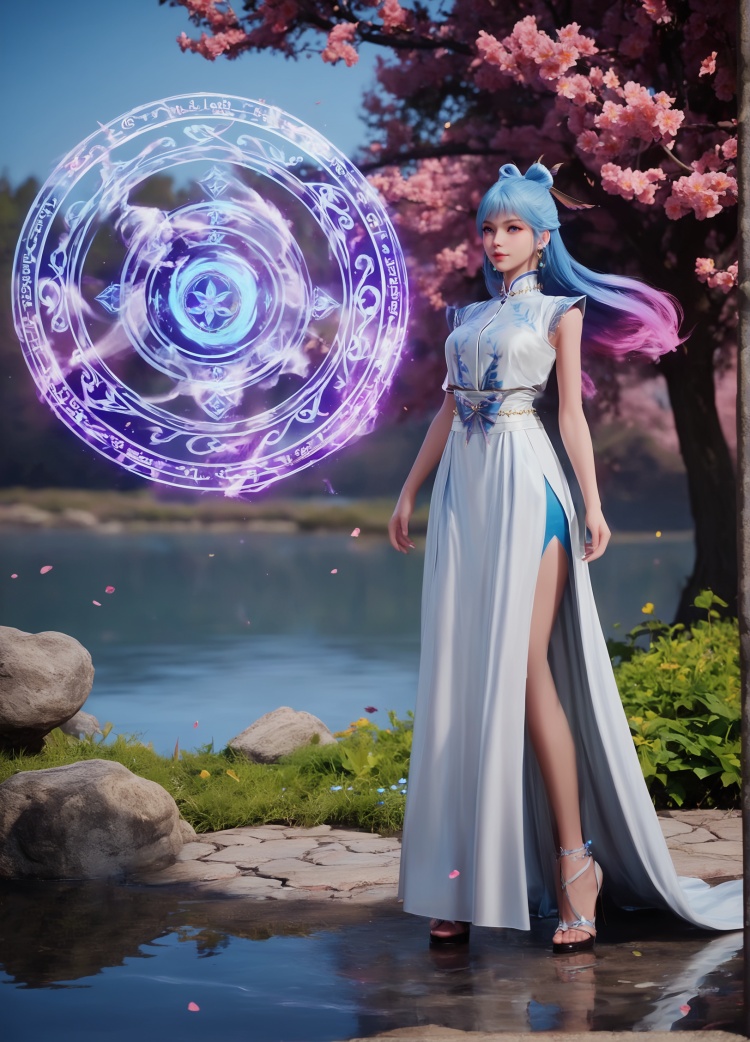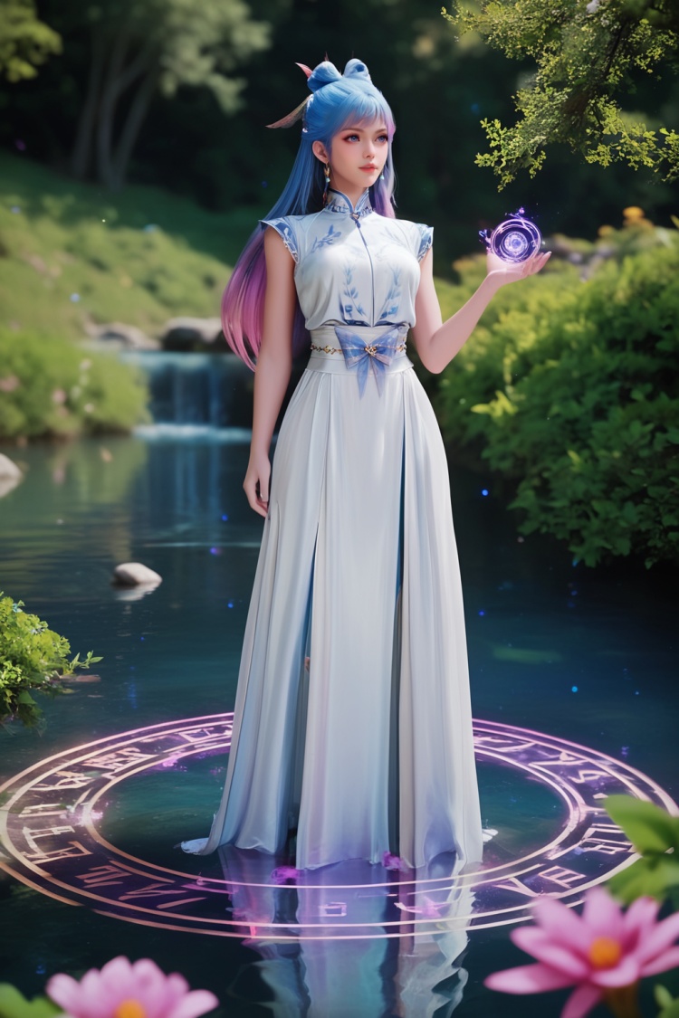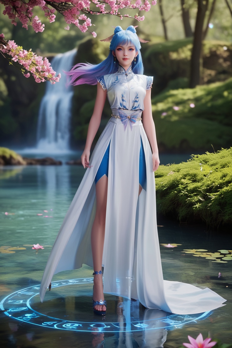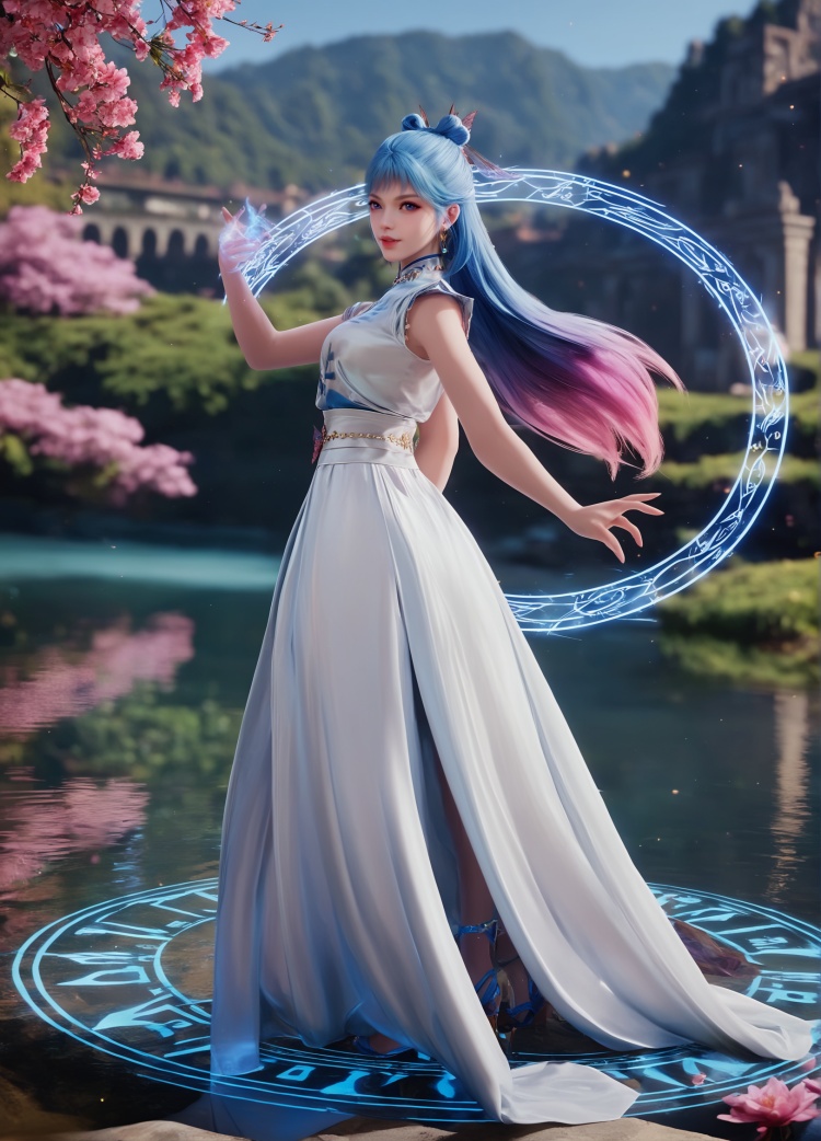 miss wangdonger, solo, white dress, blue eyes, blue hair, hair ornament, long hair, earrings, jewelry, hair bun, sash, strappy heels