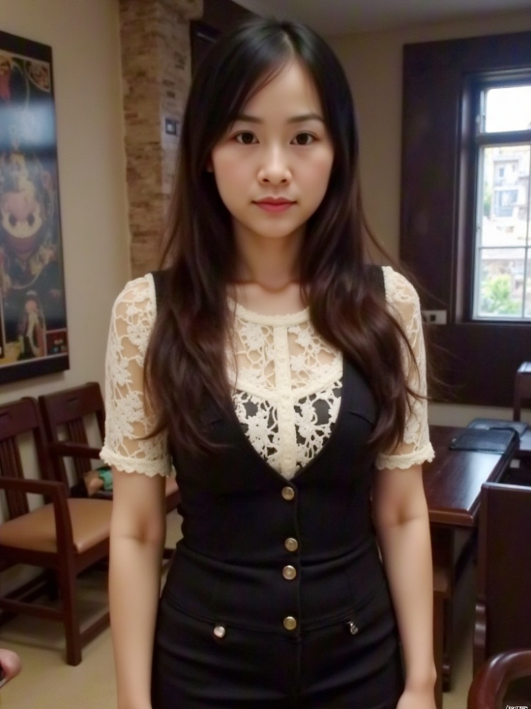 (Masterpiece, Ultimate Detail, Best Quality: 1.2, Surrealism: 1.4), (Facial Detail: 1.4, Hair Detail, Clear Portrait, Correct Perspective, Bright Colors), a woman, wusiming, Long hair, medium breasts, indoor, (black pencil skirt, lace short sleeved top, white hollowed out see through top, black vest), thighs, (perfect figure, full body structure, woman looking at the audience, : 1.4, non half body portrait: 1.4)