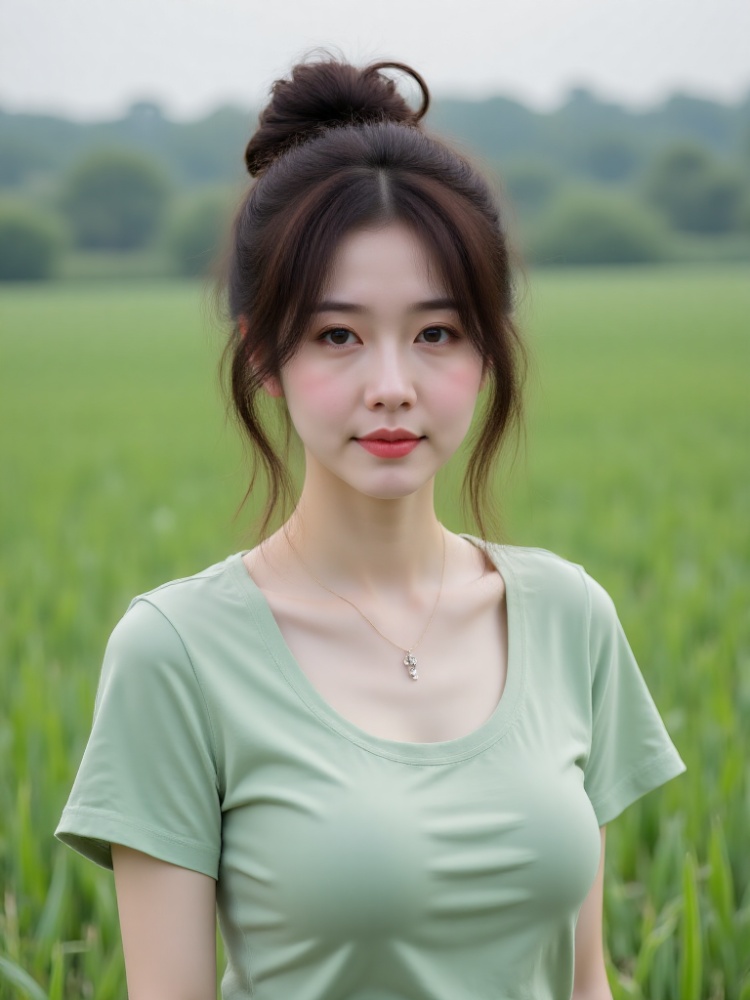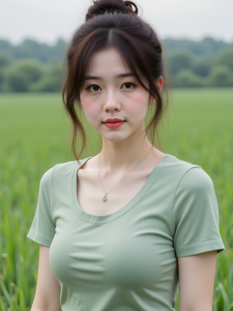 A young woman standing among the green fields. She has dark brown hair, some of which naturally drooped, and the rest was tied into a loose bun behind her head. The woman was wearing a light gray-green short-sleeved T-shirt with a rounded U-shaped collar, and the close-fitting tailoring showed her figure. She wore a thin necklace between her neck, and a small decoration was hanging on it. The background is a vast green field, and the blurred trees and sky in the distance form a natural and fresh environment, and the overall atmosphere is quiet and beautiful.