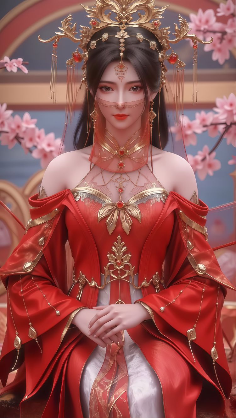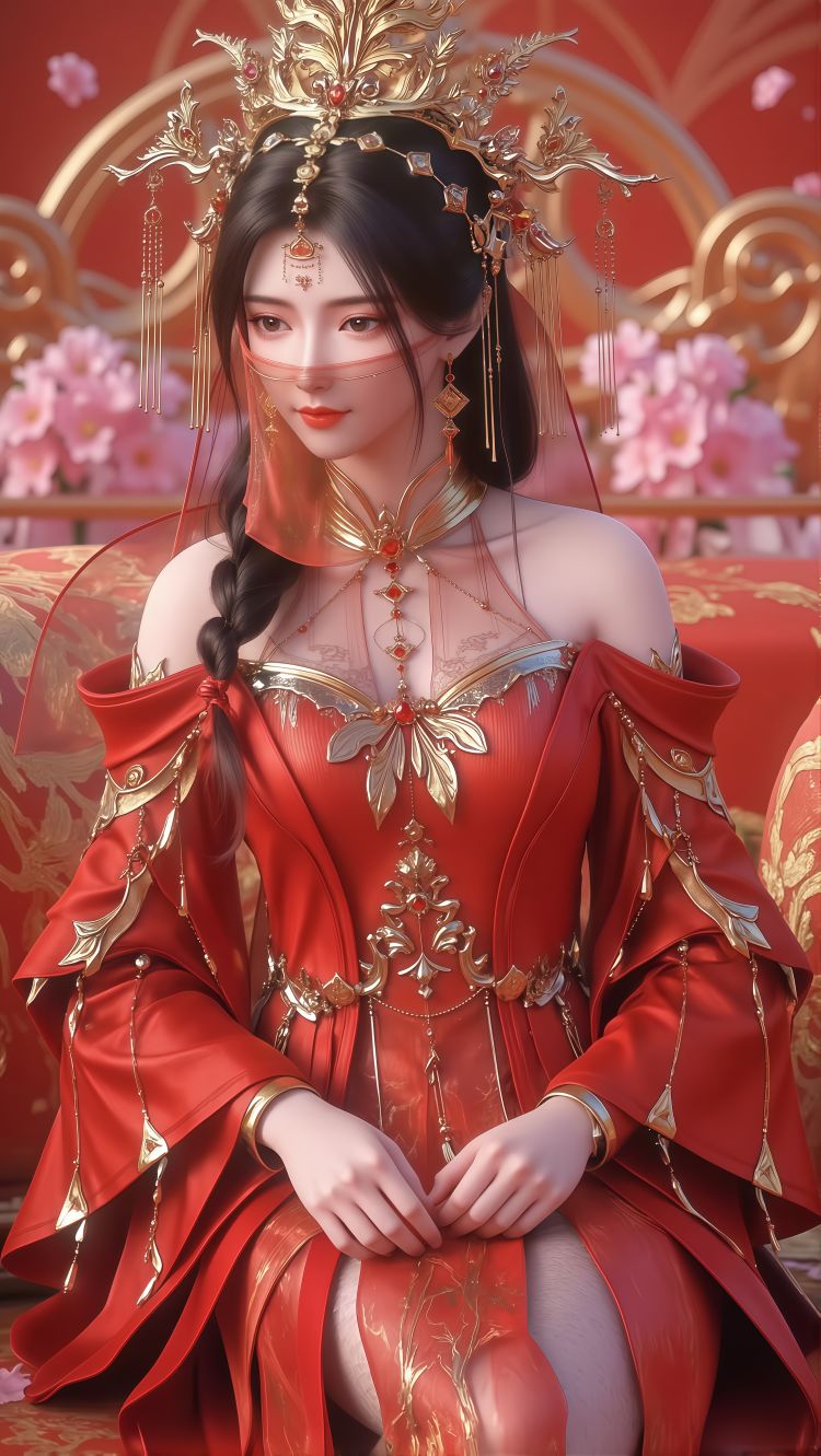 -Facial decoration: Covered with translucent red chiffon, gold bead chains, and patterned decorations, it not only adds a hazy beauty, but also blends seamlessly with the color and material of the wedding dress, making it even more mysterious and charming when it appears.