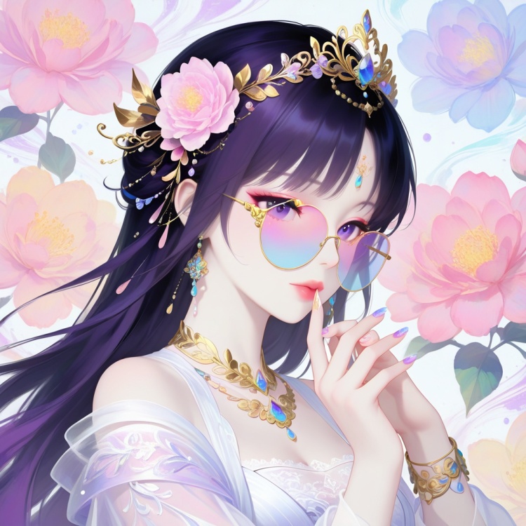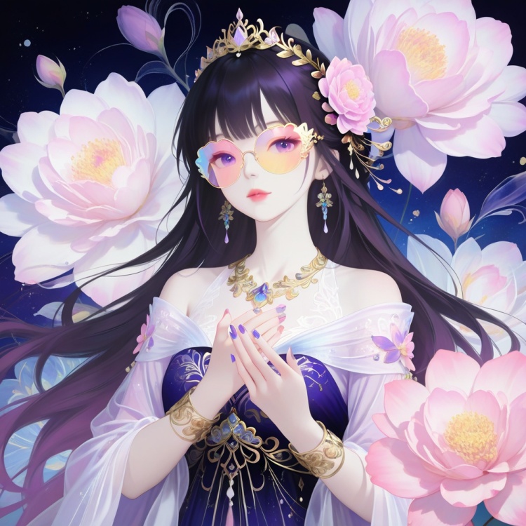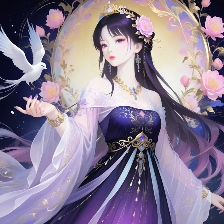 FE489-6,in the style of a digital illustration, showcasing a serene, ethereal woman. The artwork, created in a highly detailed and realistic digital medium, features a young woman with pale, porcelain skin and delicate features. Her long, dark hair cascades gracefully, adorned with a floral hairpiece, and a small, ornate tiara, hinting at her regal status. Her attire is elaborate, with an ornate, off-the-shoulder gown in shades of purple and white, intricately embroidered with gold and adorned with delicate lace. The gown has an ethereal, flowing quality, enhancing her graceful pose. Her right hand is gently extended, with long, manicured nails painted in soft pastel shades, adding to her delicate, otherworldly appearance. The background features a soft gradient of white and black, with delicate, abstract brushstrokes and a few pink flowers in the foreground, enhancing the mystical atmosphere. The overall composition is elegant and serene, with a sense of timeless beauty and otherworldly elegance.
